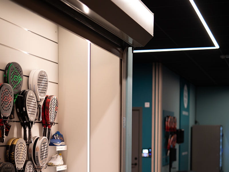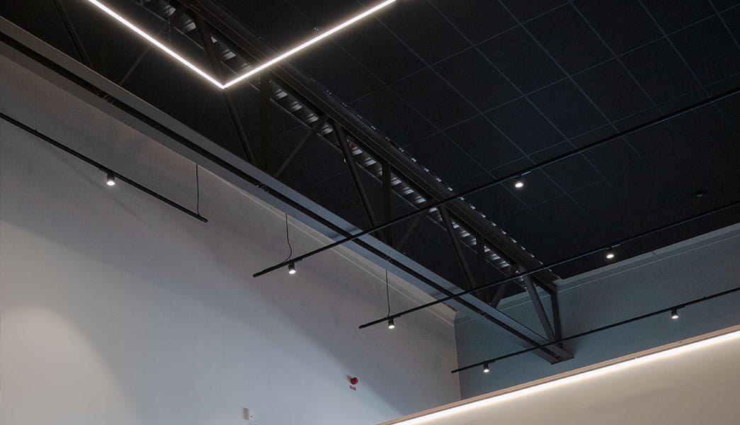 Vel inden for dørene mødes vi i loftet af den samme vejledende LEDstrips i sorte profiler, som fører frem til receptionen. Sorte Level Quick ISO'er er monteret i det lige så sorte loft og fokuserer på receptionen sammen med skinnespottene Optic Track M. Efterhånden som vi bevæger os længere ind i det større træningslokale, dukker LEDstrips op igen i profiler med opal afdækning flere steder, både som vejledende belysning og generel belysning. De skaber karakter, modernitet og effektive lyslinjer i loftet.