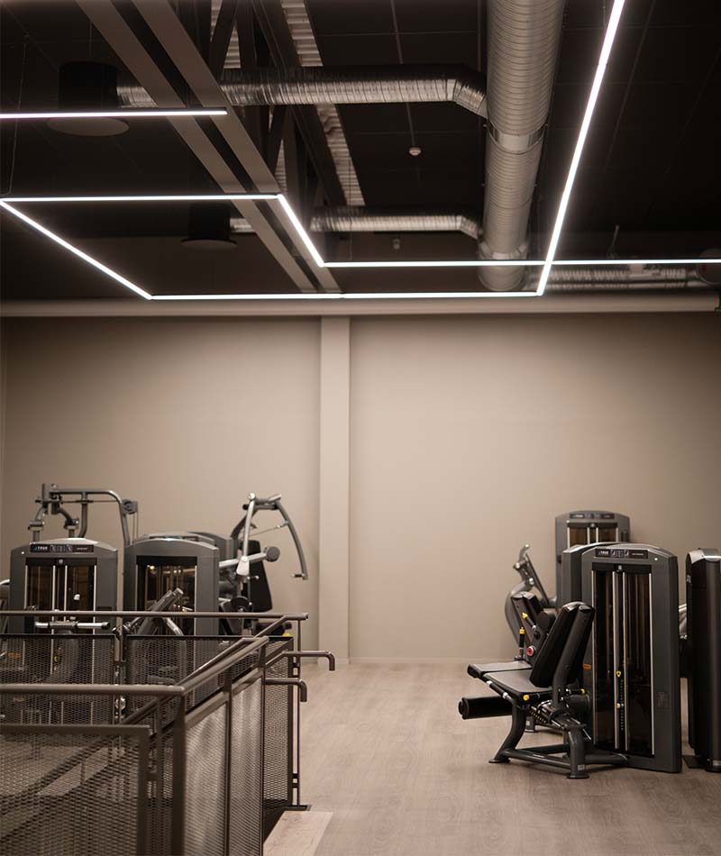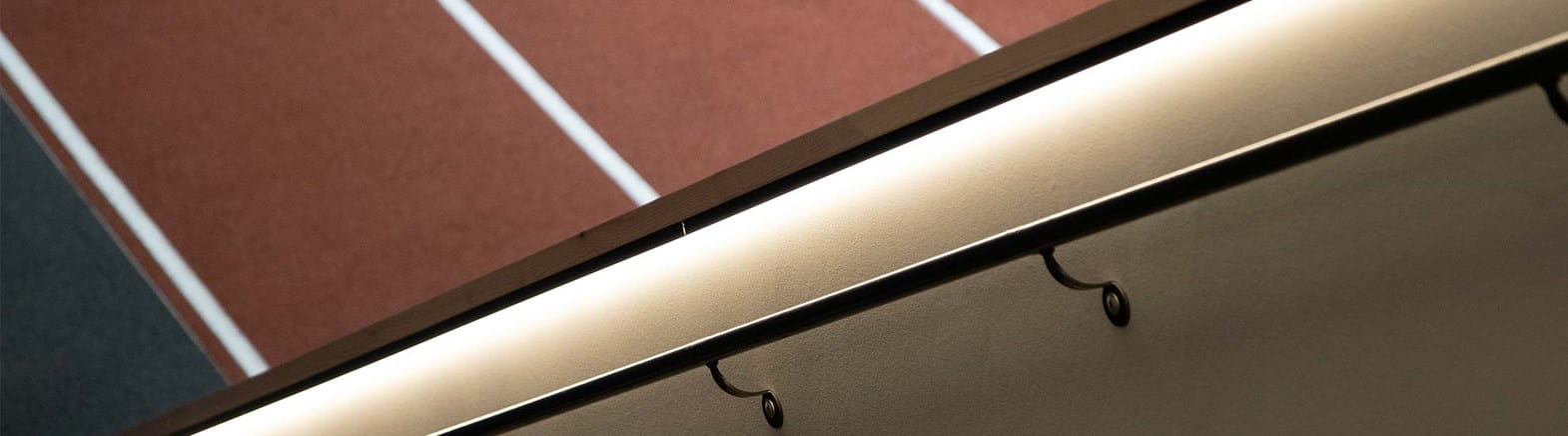 Sidst men ikke mindst har vi træningsanlæggets omklædningsrum og sauna. LEDstrip RX HDI IP20 i sorte profiler Maxi U monteres i lige linjer og skaber kontrast mod det hvide loft. I saunaen bruges LEDlisten Heatline sammen med Heatspot G2 til at skabe et varmt hvidt baglys med glødetrådskarakter. Heatspot G2 er et lille og diskret armatur, der giver en stemningsfuld og behagelig belysning med fine lysmønstre på saunaens vandrette træpanel.