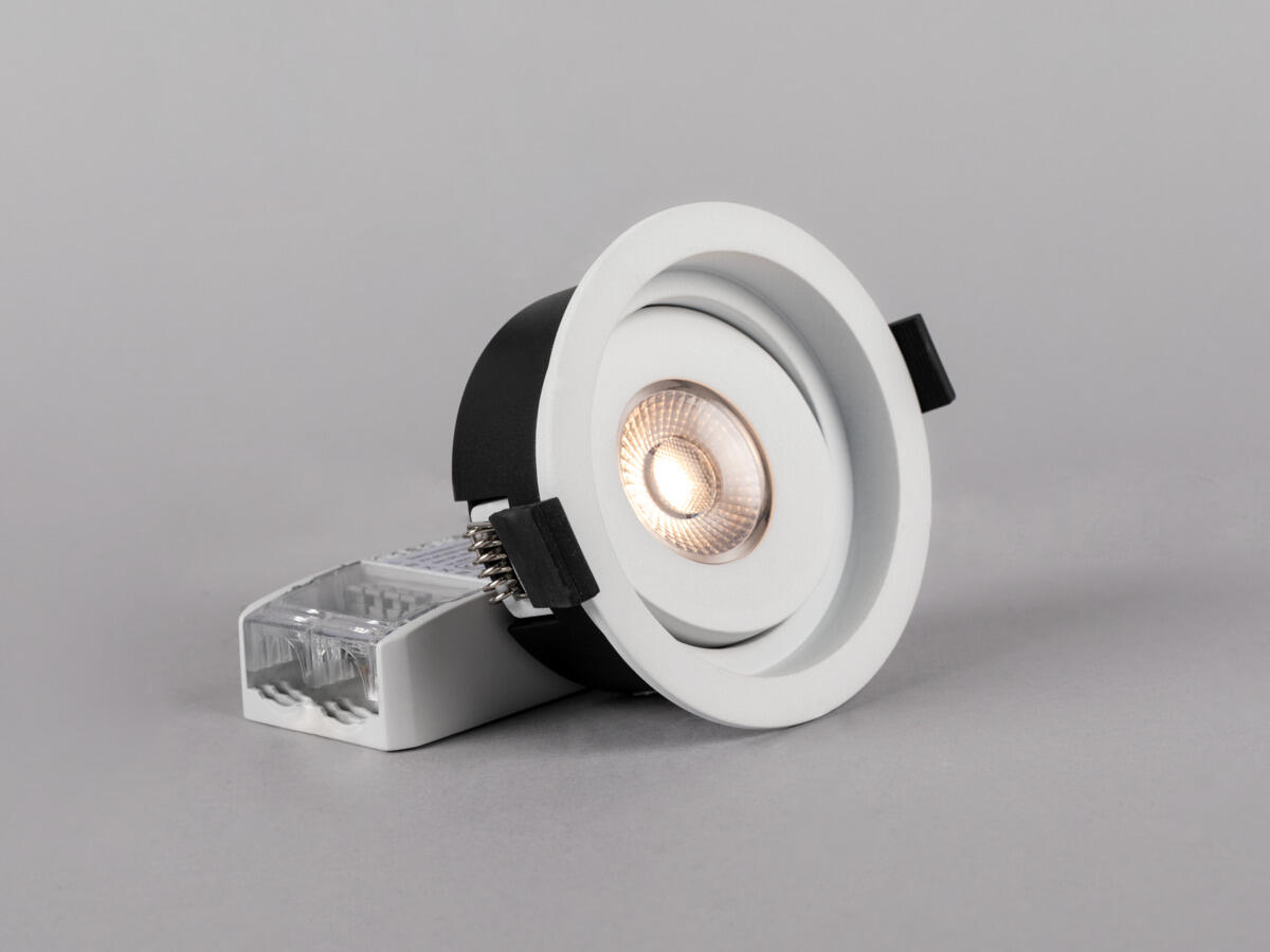 Vipbar downlight med lav indbygningshøjde tilpasset montering i lægter 28mm og godkendt til montering direkte mod isolering. Hulboring mellem 55-63mm - perfekt erstatning af gamle halogenarmaturer ved ROT-arbejde. Reflektorteknik, godt afblændet lysbillede med særdeles god farvegengivelse, Ra>95. IP44-udførsel til montering inde og ude. Fasedæmpbar driver for nem tilslutning til 230 V, 3-polet trykklemme til sløjfning og skruefri trækaflastning til kabel. Kan dæmpes med de mest almindelige lysdæmpere på markedet.