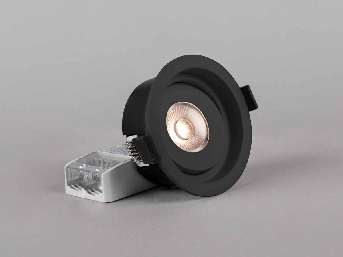 Vipbar downlight med lav indbygningshøjde tilpasset montering i lægter 28mm og godkendt til montering direkte mod isolering. Hulboring mellem 55-63mm - perfekt erstatning af gamle halogenarmaturer ved ROT-arbejde. Reflektorteknik, godt afblændet lysbillede med særdeles god farvegengivelse, Ra>95. IP44-udførsel til montering inde og ude. Fasedæmpbar driver for nem tilslutning til 230 V, 3-polet trykklemme til sløjfning og skruefri trækaflastning til kabel. Kan dæmpes med de mest almindelige lysdæmpere på markedet.