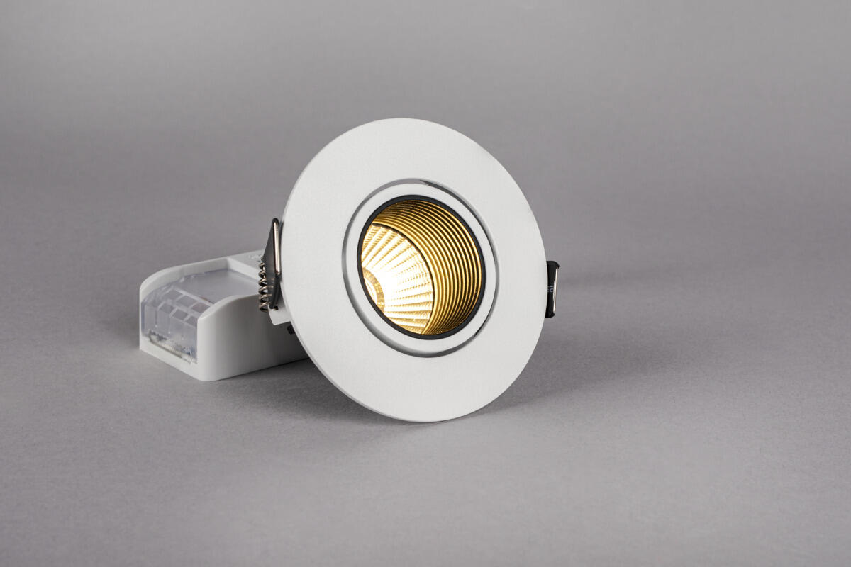 Effektivt og vipbar downlight med lav indbygningshøjde og godkendt til montering direkte mod isolering. Moderne LED- og reflektorteknik giver højt lysudbytte med distinkt og godt afblændet lysbillede med særdeles god farvegengivelse, RA>95. Et IP44-armatur, som er let at installere, komplet med fasedæmpbar driver, 3-polet trykklemme med mulighed for sløjfning samt skrueløs trækaflastning til kabel eller flexrør 16mm. Dæmpbar med de mest anvendte lysdæmpere på markedet.
