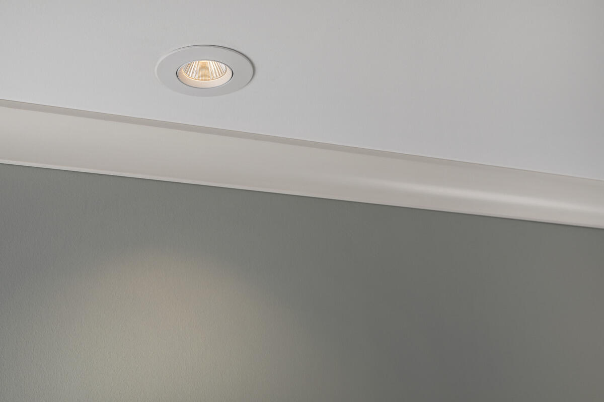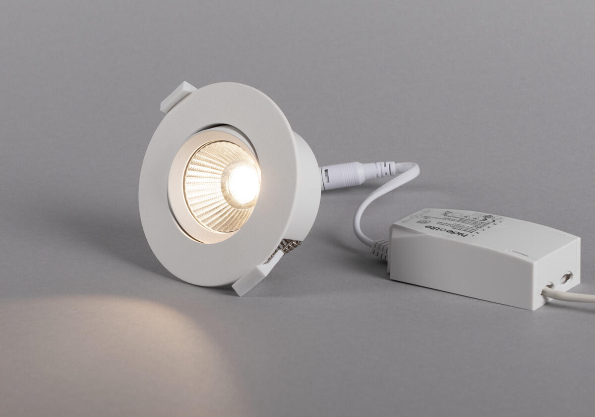 Vipbar downlight med lav indbygningshøjde tilpasset montering i lægter 28mm og godkendt til montering direkte mod isolering. Hulboring mellem 55-63mm - perfekt erstatning af gamle halogenarmaturer ved ROT-arbejde. Reflektorteknik, godt afblændet lysbillede med særdeles god farvegengivelse, Ra>95. IP44-udførsel til montering inde og ude. Fasedæmpbar driver for nem tilslutning til 230 V, 3-polet trykklemme til sløjfning og skruefri trækaflastning til kabel. Kan dæmpes med de mest almindelige lysdæmpere på markedet.