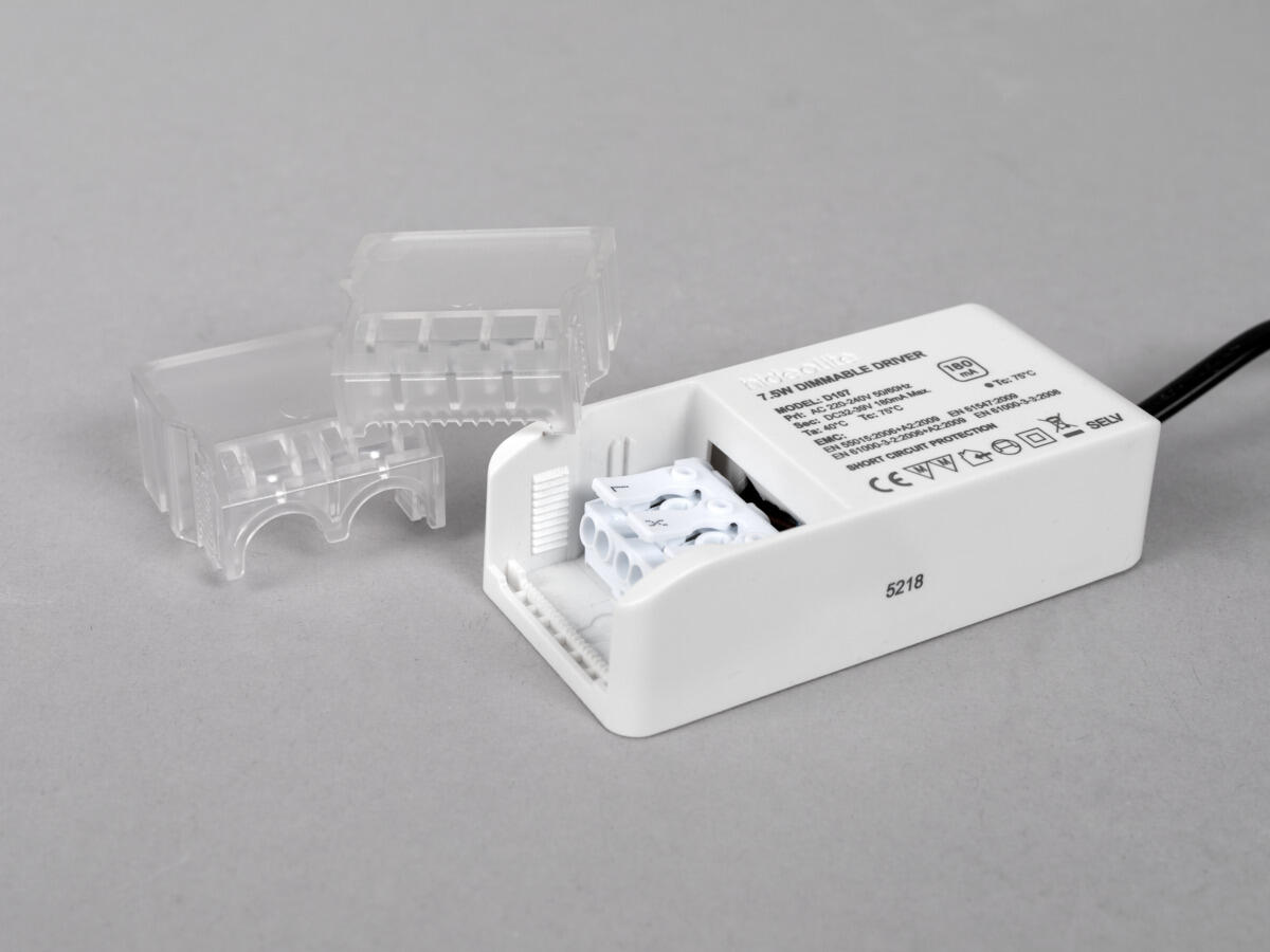 Fasedæmpbar driver til konstantstrømsarmaturer 180mA. Sløjfbar trykklemme til viderekobling og skrueløs trækaflastning til kabler fra 0,5-2,5mm² på primærsiden, til kabel/16mm flexrør. Sekundærsiden er bestykket med færdig kabelafslutning og phono-stik.