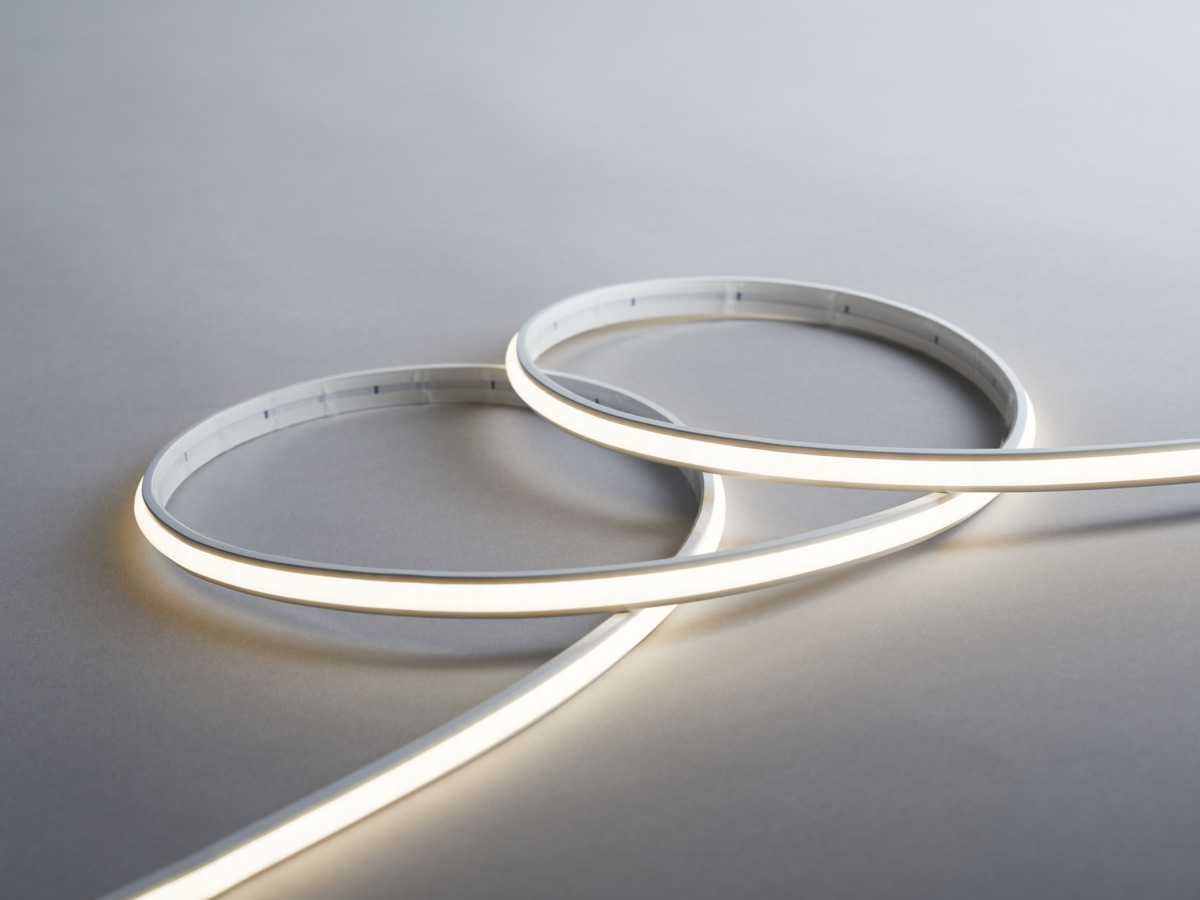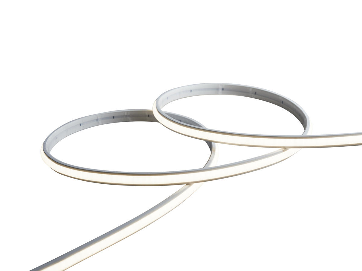 LED-strip som er indkapslet opalfarvet hus af silikone, som skaber en jævnt lysende linje uden profil og dæklåg. COB-teknik med kort afstand mellem dioderne giver virkelig god effektivitet. Kort afskæringsinterval 30 mm og søm skarring gør det nemt at skabe tilpassede længder. Leveres som standard i ruller á fem meter med 2 m tilslutningskabel i hver ende, 2 stk. endeafslutninger, selvklæbende tape for nem montering. På forespørgsel leveres løbende meter med tilslutningskabel efter ønske, løbende meter leveres som standard uden tilslutningskabel. Strømforsyning bestilles separat alt efter ønsket dæmpningsteknik og placering. Maksimal længde 5 m.