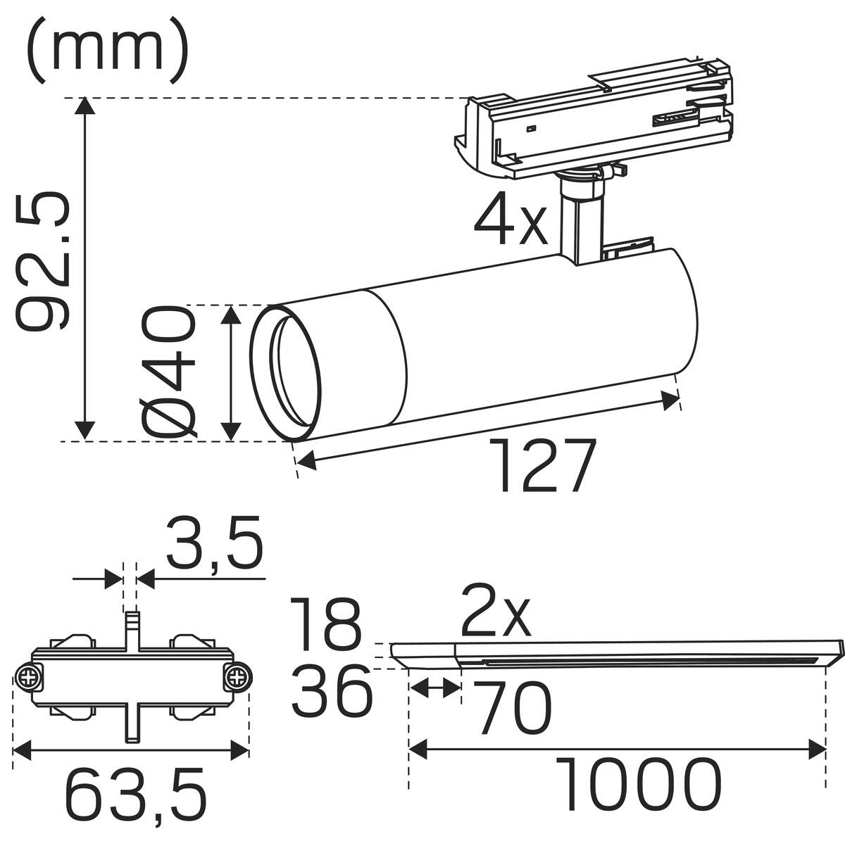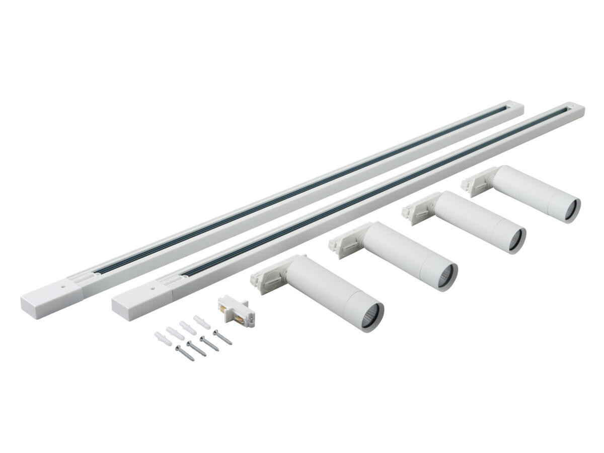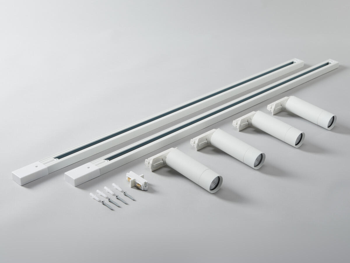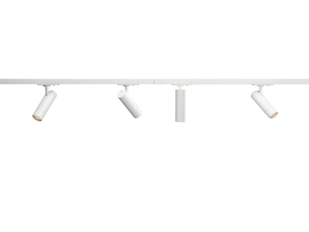 Minimalistiske tracklights, der kan dæmpes, med udskiftelig LED og driver – bygget til fremtiden. Via DIP-Switch colour temp-funktionen kan farvetemperaturen nemt justeres med et tryk på en knap direkte på armaturets bagside (ikke Tune). Reflektorteknologien sikrer et højt lysudbytte med et tydeligt og klart lysbillede – perfekt som accentbelysning, hvor man ønsker at rette lyset mod det, man vil fremhæve, men også som almen belysning i både private og offentlige miljøer. Adapter med lav indbygningshøjde til 1-faset skinne. Armaturerne kan suppleres med Honeycomb-tilbehør for at opnå øget afblænding. Det er nemt at udskifte reflektoren med et linsetilbehør for at tilpasse lysbilledet efter behov. Sættet består af 4 stk. armaturer, 2 stk. 1 m 1-fasede skinner, 2 stk. tilslutningsstykker, 2 stk. endestykker, 1 stk. samlestykke.