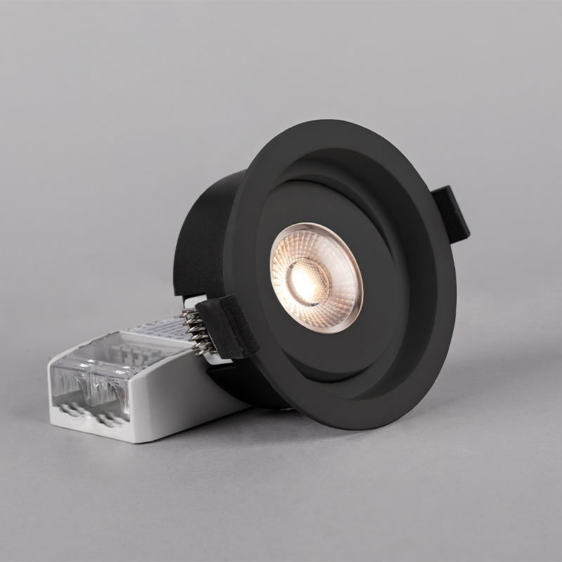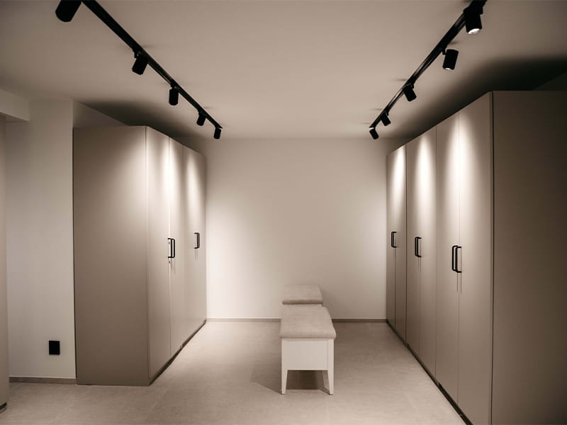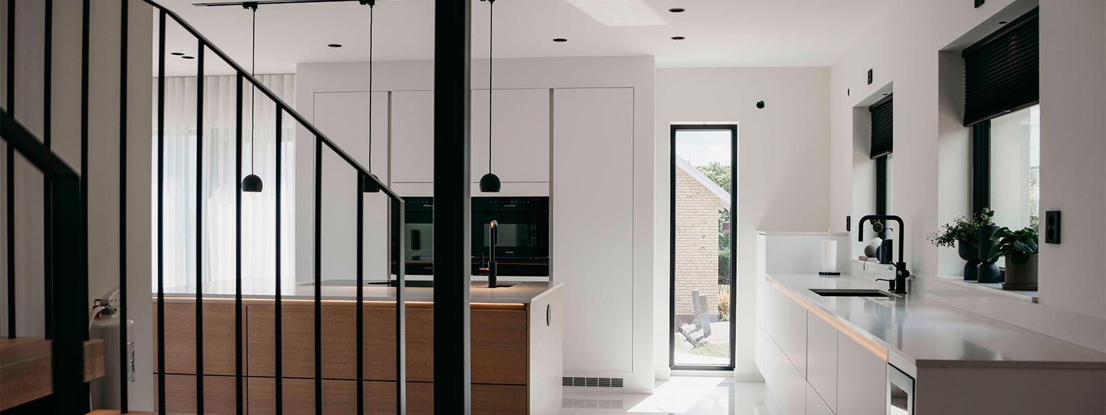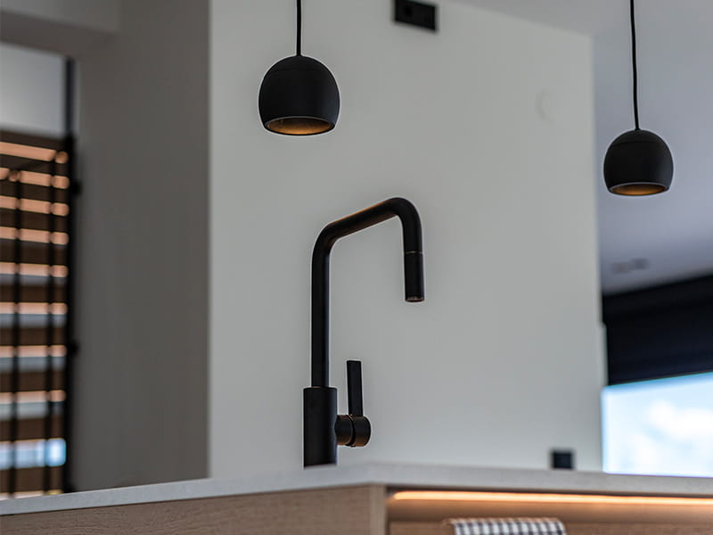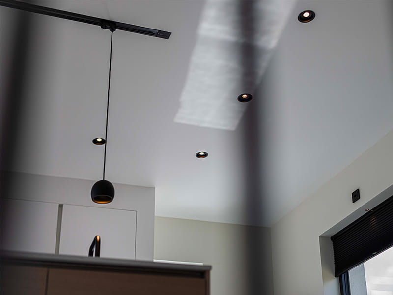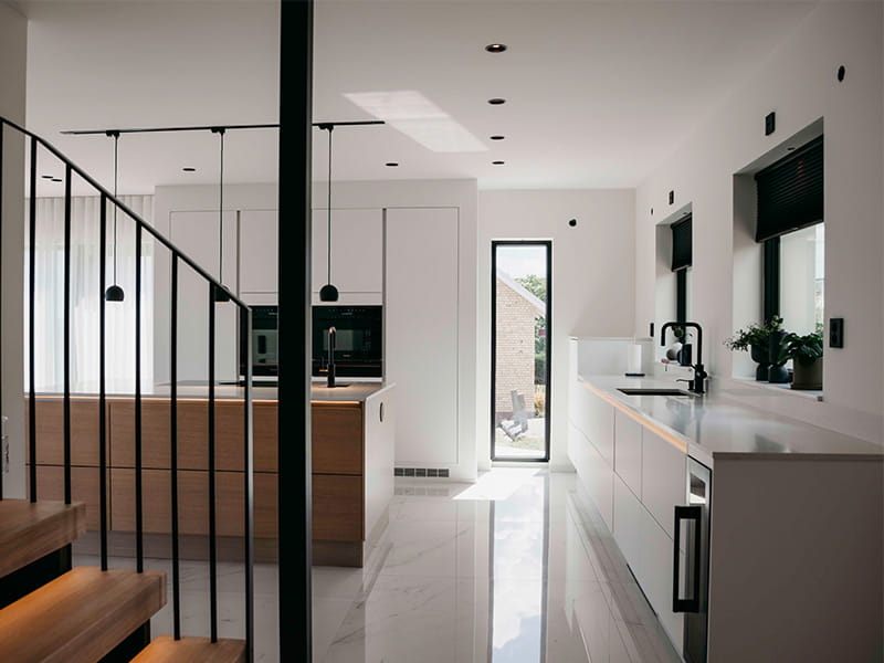 The first thing that greets you as you enter the house is a bright and inviting hallway, where the recessed black fixtures, Level Quick ISO, create an elegant contrast against the white ceiling. These discreet fixtures feature a recessed and adjustable light source that provides soft, glare-free lighting. The black finish complements other dark details in the home, adding a sophisticated touch to the bright surroundings. The fixtures seamlessly guide you into the kitchen, where they are positioned to provide optimal task lighting over the countertops. Instead of forming a classic "grid pattern" on the ceiling, the fixtures follow a carefully thought-out line, enhancing the home's flow and creating a natural transition from the entrance into the living spaces.