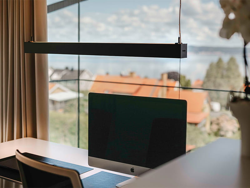 In the home office, a black Actor Pendant luminaire is strategically placed above the desk. This suspended interior fixture provides directed light that enhances focus on workspaces and areas requiring additional brightness. Actor Pendant meets the essential standards for work environments, including screen and UGR requirements (UGR<19 office), ensuring comfortable and glare-free lighting. The sleek design in black-lacquered aluminum blends into the room, creating an elegant and thoughtful expression while meeting technical requirements for an optimal work environment. Actor Pendant is ideal for offices, meeting rooms, and classrooms. It is crafted with a white or black-lacquered aluminum frame and comes with either a black or transparent cable, depending on preferences.