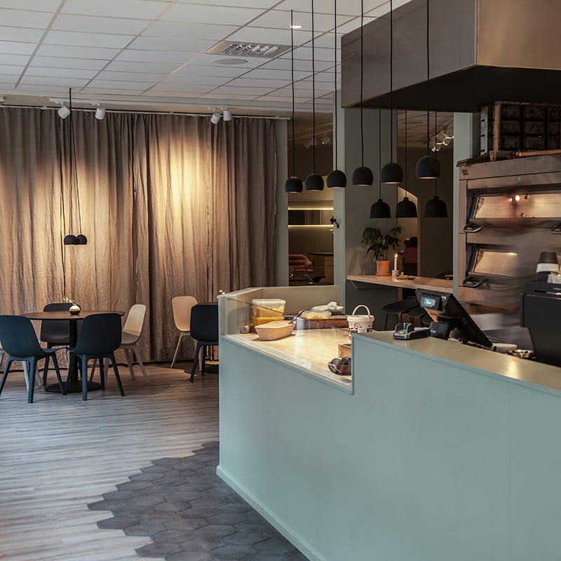 Already outside STUK's entrance, you can clearly feel the scent of freshly baked pizzas and homemade bread. A scent that together with nice music and the lighting inside, gives a feeling of home comfort. Here, the interior designer Sara Rudenstam, together with the owners Johan Salestam and Andreas Roman, has carefully selected material and colour to create this cozy concept. When it was time to choose lighting, we at Hide-a-lite were contacted. Starting out being an inquiry about which colour temperature should be chosen for the bakery, we ended up with a complete lighting proposal. The chosen colour temperature was 3000K after a test lighting in the room. This colour temperature fits well with the green painting on the walls, and in addition, the warm white light hopefully makes the guest stay for a longer time. In the end, a lighting concept that enhances the interior but also contributes to the homely feel that was disired in the room.