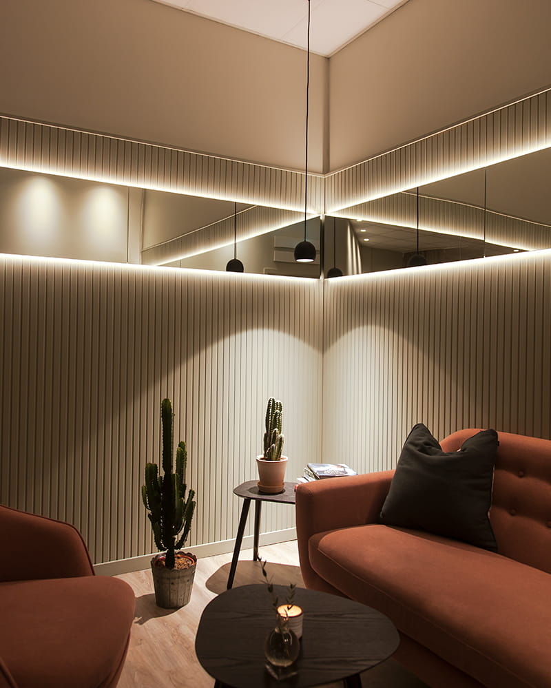 At the far end of the room, there is a large sofa which leads the thoughts to a living room. Here, many people can sit down together and, the cozy and homely feeling will appear quickly. Landscape mirrors are mounted on the wall above the sofa, which attract the eye - thanks to the light from our LEDstrip RX IP20. The LEDstrip is installed behind the mirror as hidden accent lighting in Profil-U High, and the light is directed both up and down. A decorative and atmospheric lighting choice.