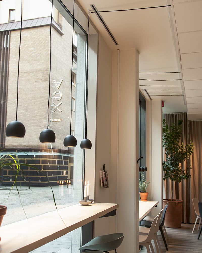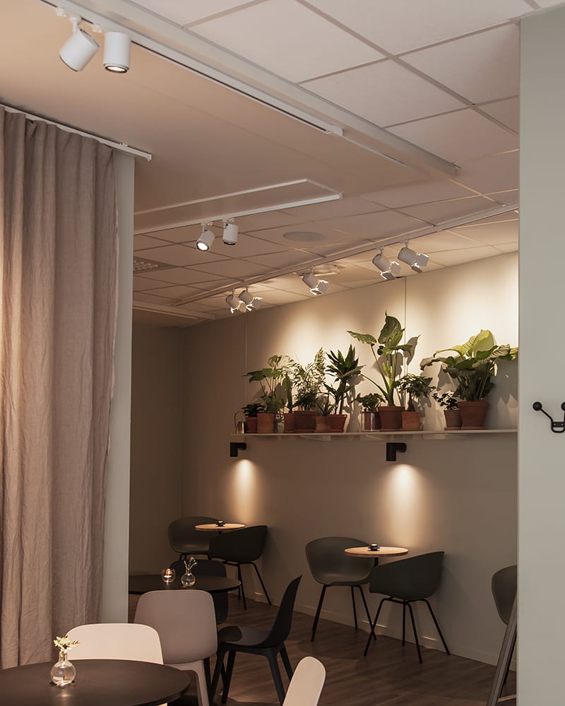 Further into the cafe, the feeling of a home becomes more evident with, among other things, pot plants and textiles in linen. Here, the light from our spotlights Focus Track Mini and Micro, is directed to emphasize the structure of the linen and create a shadow play from the foliage of the plants. To further enhance the feeling of home comfort, different types of luminaires are placed at different heights. Globe G2 are mounted in clusters, while other tables are illuminated with our Twist Round.