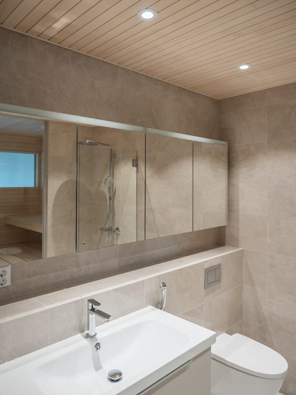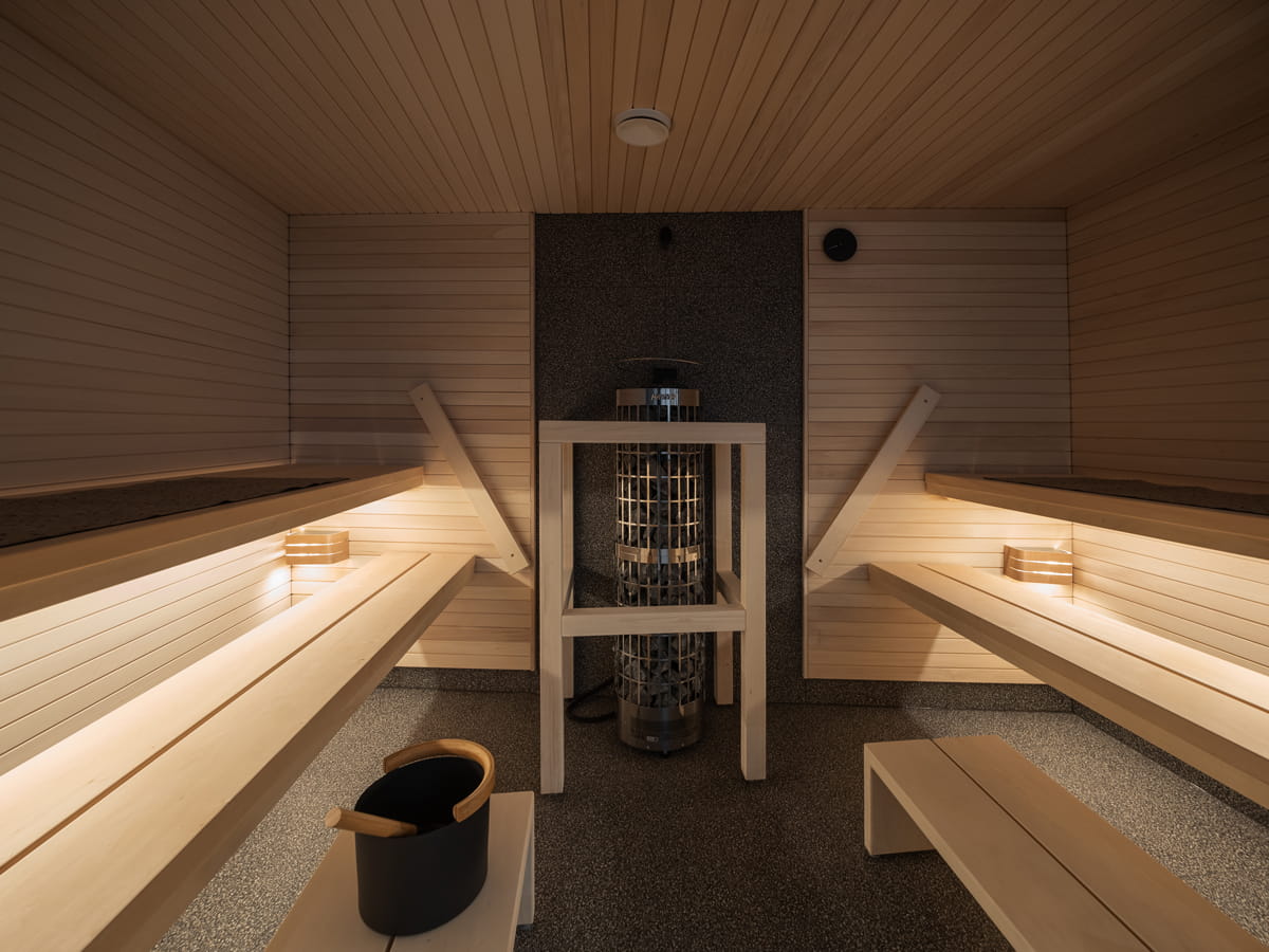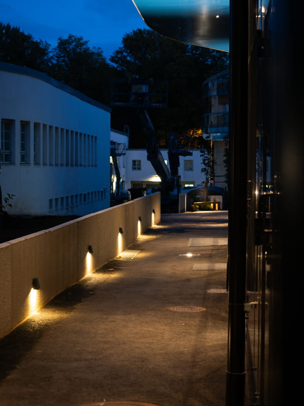 In Töölön Meander's outdoor areas, functionality and aesthetics have been prioritized to create a safe and harmonious environment for residents. Hide-a-lite luminaires are used in stairwells, facades, courtyards, and communal spaces, giving the entire building complex a unified appearance. The lighting in the building's sauna area is designed to create a calming and warmly inviting atmosphere. Heatline luminaires under the sauna benches provide soft and indirect light that accentuates the sauna's materials and creates a relaxing ambiance without glare.