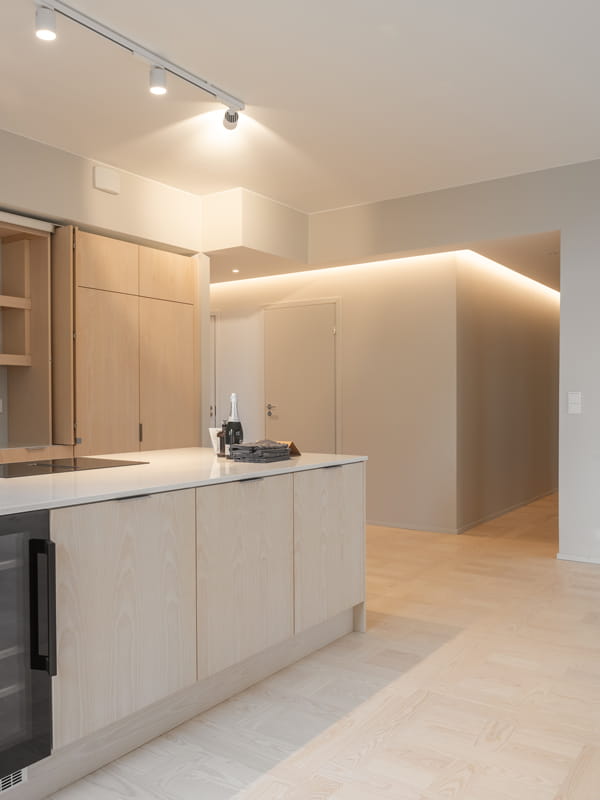 Töölön Meander is a unique luxury residential building located in Taka-Töölö, Helsinki, Finland, on the shores of Taivallahti in a historic barrack area. The building was designed by the world-renowned architect Steven Holl, who is known for his passion for light, nature, and their many expressions. Holl's distinctive design style is clearly evident in Meander, where the sculptural architecture meets practical solutions with respect for the environment and nature. In Finland, Holl is best known for his work on the Museum of Contemporary Art, and Meander follows in this tradition with its harmonious combination of light and form. The building features a comprehensive lighting solution from Hide-a-lite, both indoors and outdoors, enhancing the living experience and creating a unique atmosphere. Hide-a-lite also participated in the lighting design process to ensure that the lighting accentuates the building's architecture. The developer, Newil&Bau, has set a new standard for resident services in the Finnish housing sector.