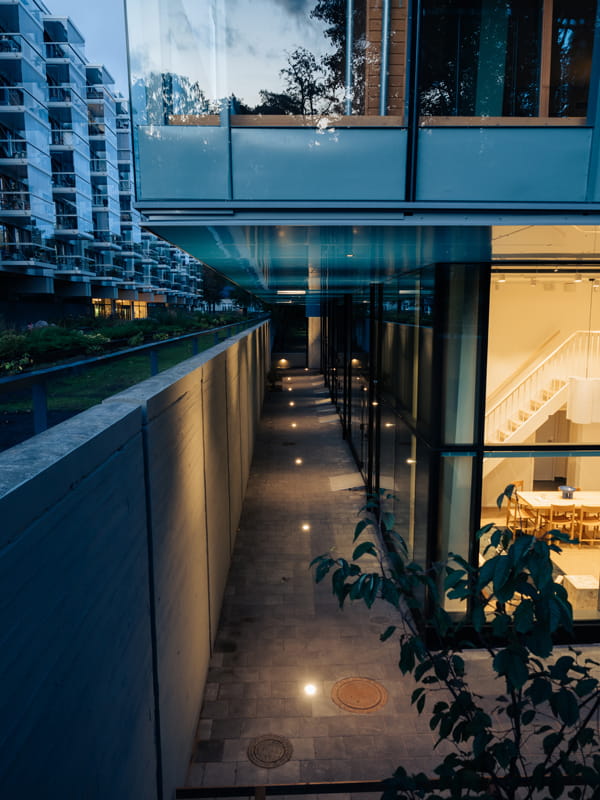 Outdoors, special attention has been paid to the lighting of pathways. Wall luminaires guide residents with soft light along safe routes. Recessed ground fixtures add visual effects by highlighting plantings and trees, giving the garden a vibrant look even after dark. On the facades, light sources have been directed to accentuate the building's architecture and sculptural details.Outdoor lighting has also been designed to minimize glare and disturbance to surrounding buildings. Dimming options provide both energy savings and enhanced comfort. In the stairwells, LED strips create elegant light and shadow plays on walls and ceilings, which guide residents into the building in a sophisticated manner. The chosen lighting solutions support Töölön Meander's architectural entirety and ensure that light and shadow elegantly complement the surrounding environment.