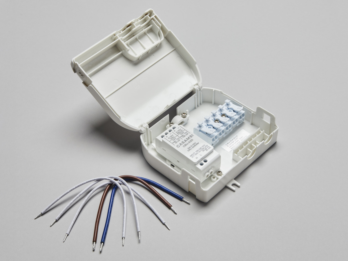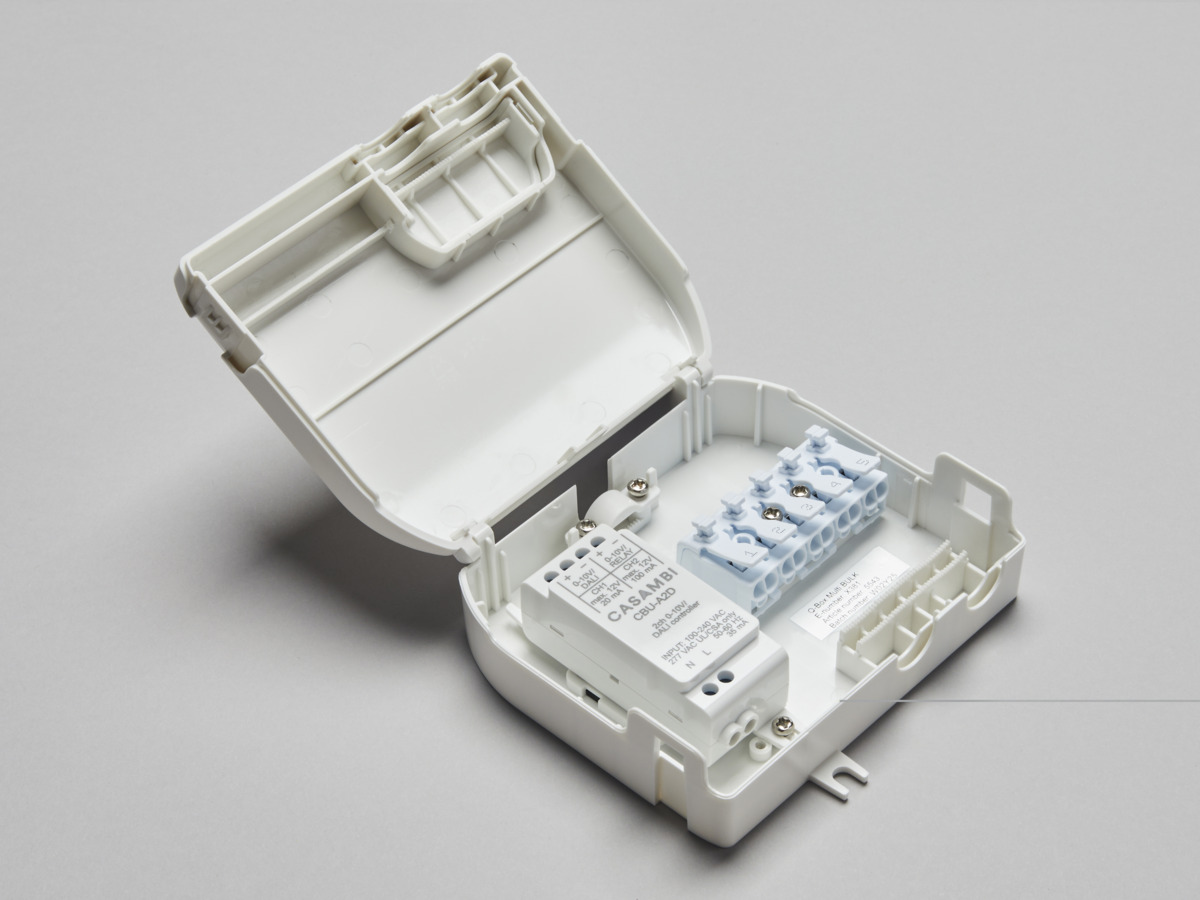 Q-box Multi is our connection box for quickly connecting and controlling lighting via Casambi, which gives you full, direct control of the light via a simple app. The box is IP20 rated and intended for placement in suspended ceilings or surface-mounted indoor installations. The box can be attached with screws to any surface. Supplied with screws for mounting Casambi smart pucks and cabling for smooth connection between terminal block and puck. Strain relief for both cabling and hose, loop-in loop-out.