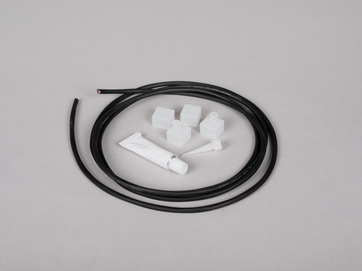 Connection kit LEDstrip Neon Side IP67. Contains 2 end caps and 2 end caps for cables, 2m rubber cable (black) and a 10ml tube of silicon.