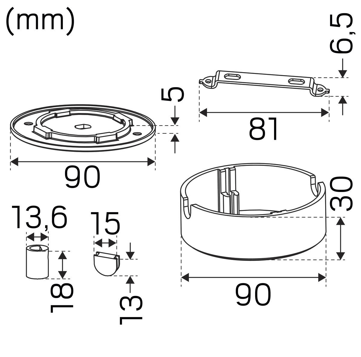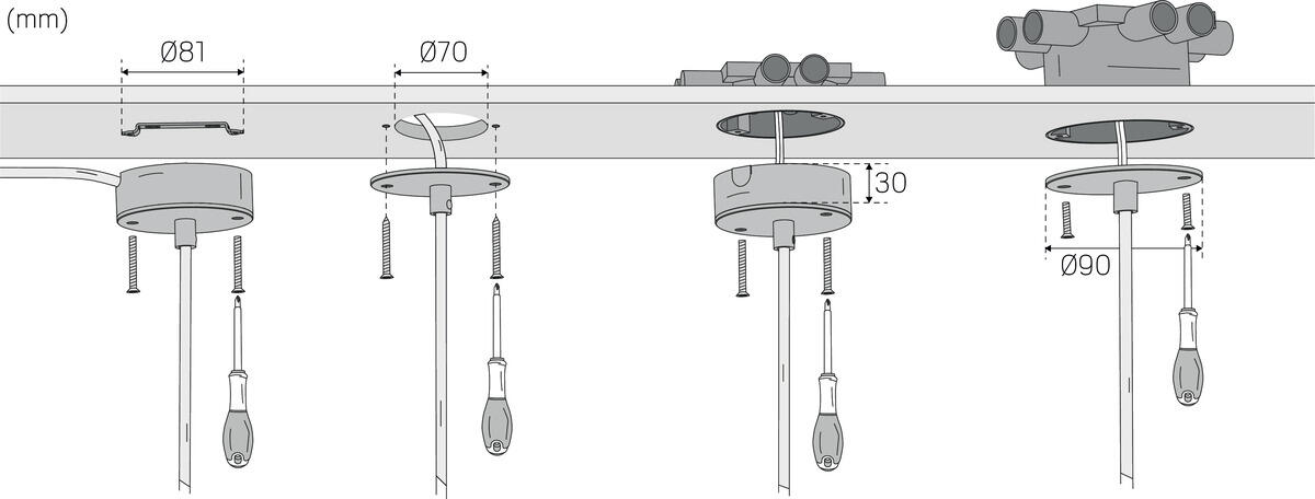 Accessories for hanging/mounting of pendant luminaires. Adapted for recessed installation in regular holes with installation springs. Also comes in a version for surface mounting directly into ceilings alternatively into or onto ceiling box with screws.