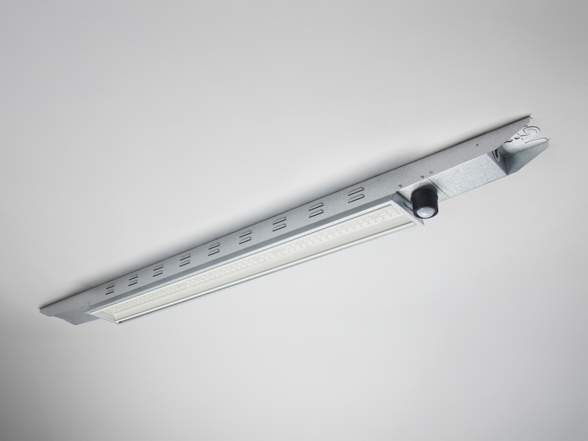 Industrial luminaire IP44 in basic model, replaces T5 and T8 luminaires with lower energy consumption and reduced maintenance. Luminaire of coated steel plate. Line prismatic diffuser in impact resistant PC with opal film and smart folding end caps. Push-in terminal, through wiring, one bushing in each end cap and two in the middle, one of which is centred, for concealed cable routing. Perfect when you are looking for a simple solution that does the job – basement storage, laundry rooms or simple industrial premises. Can be adjusted to lower light output and wattage via DIP-Switch Power.
