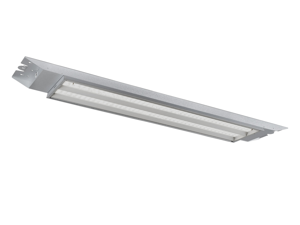 Highly efficient fluorescent tube replacement. Sliding multi-fasteners and separate connection space in end caps. 5x2.5mm2 push-in terminals for through wiring as standard, M20 fitting and knockouts in each end cap for easy installation. Adapted for installation on luminaire rail, keyhole for installation in ceiling and integrated wire suspension with hook and hook lock. D-marked, IP65 and IK09-classed for installation in rougher environments and areas with heightened fire risk. Adjustable lumen output via DIP-switch Power (On/Off and S). Suitable for example in car parks and dusty and dirty industries.