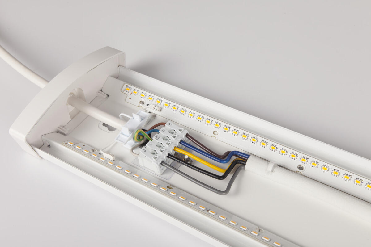 Highly efficient fluorescent tube replacement with various control options. Body of white enamelled steel sheet metal with folding patented end caps and prismatic cover in durable polycarbonate with an opal diffuser for even light outlet. Both end caps and cover are recycled plastic. Replaceable LED and driver, possible to choose colour temperature and adjust lumen output via DIP-switch. Quick terminal at both ends for simple through wiring. Through wiring 5x2,5mm2 as standard. Liteline G2 is perfect where the light requirement is great and the quality requirement is high, such as production environments, garages or storage areas.