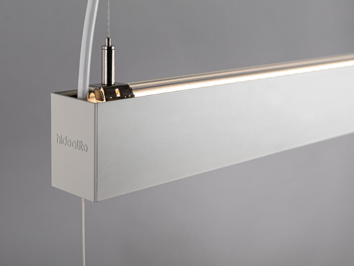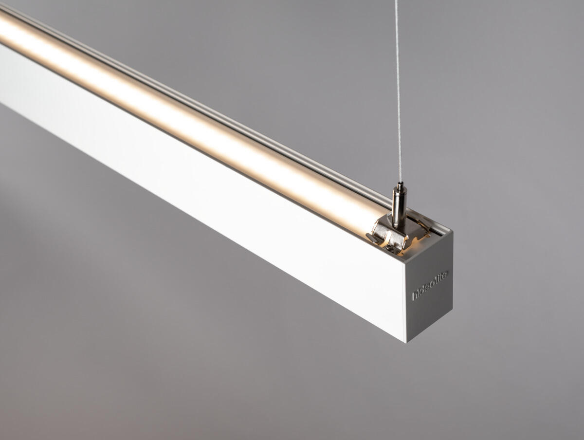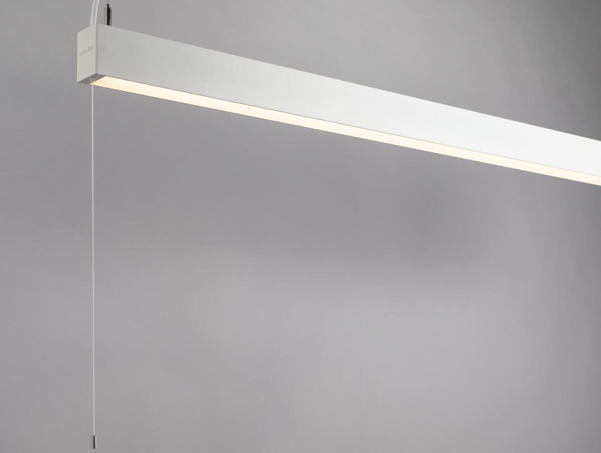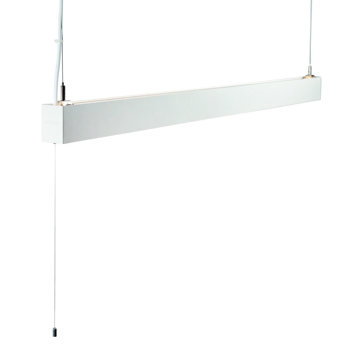 Dimmable basic luminaire with 50/50 light outlet, for offices and smaller premises. Body and end caps of white enamelled aluminium. Microprismatic louvre creates a highly glare-free downward light distribution and the uplight creates an indirect and shadow-free ambient light. A pull dim switch for common dimming of up and downlight with memory function to keep the latest setting after power cut. Complete with mounting accessories for several types of ceiling and a 2.5m cord set with earthed plug.