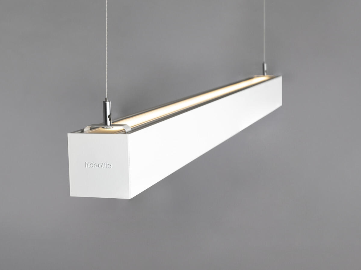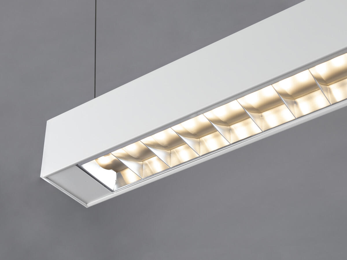 Dimmable basic luminaire with 50/50 light outlet, for offices and smaller premises. Body and end caps of white enamelled aluminium. Microprismatic louvre creates a highly glare-free downward light distribution and the uplight creates an indirect and shadow-free ambient light. A pull dim switch for common dimming of up and downlight with memory function to keep the latest setting after power cut. Complete with mounting accessories for several types of ceiling and a 2.5m cord set with earthed plug.