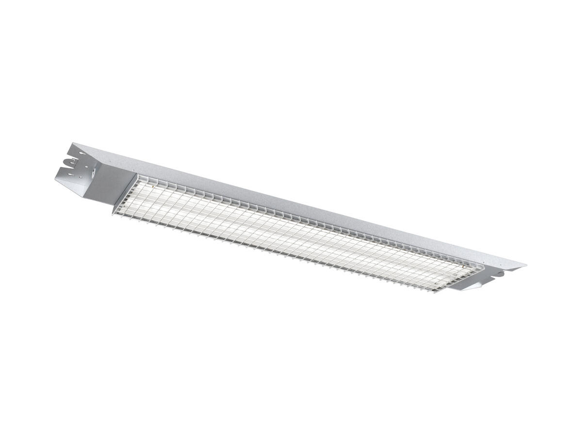 Highly efficient fluorescent tube replacement. Sliding multi-fasteners and separate connection space in end caps. 5x2.5mm2 push-in terminals for through wiring as standard, M20 fitting and knockouts in each end cap for easy installation. Adapted for installation on luminaire rail, keyhole for installation in ceiling and integrated wire suspension with hook and hook lock. D-marked, IP65 and IK09-classed for installation in rougher environments and areas with heightened fire risk. Adjustable lumen output via DIP-switch Power (On/Off and S). Suitable for example in car parks and dusty and dirty industries.