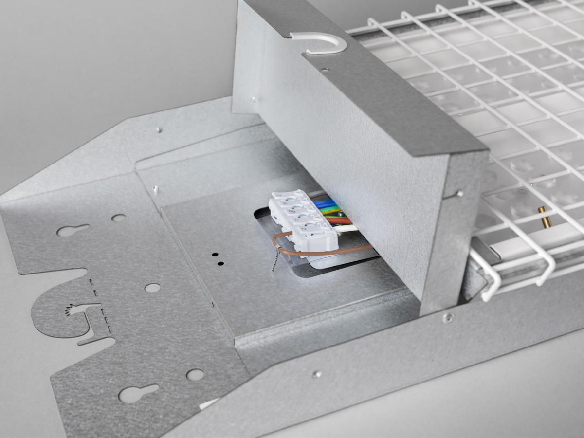 Highly efficient fluorescent tube replacement. Sliding multi-fasteners and separate connection space in end caps. 5x2.5mm2 push-in terminals for through wiring as standard, M20 fitting and knockouts in each end cap for easy installation. Adapted for installation on luminaire rail, keyhole for installation in ceiling and integrated wire suspension with hook and hook lock. D-marked, IP65 and IK09-classed for installation in rougher environments and areas with heightened fire risk. Adjustable lumen output via DIP-switch Power (On/Off and S). Suitable for example in car parks and dusty and dirty industries.