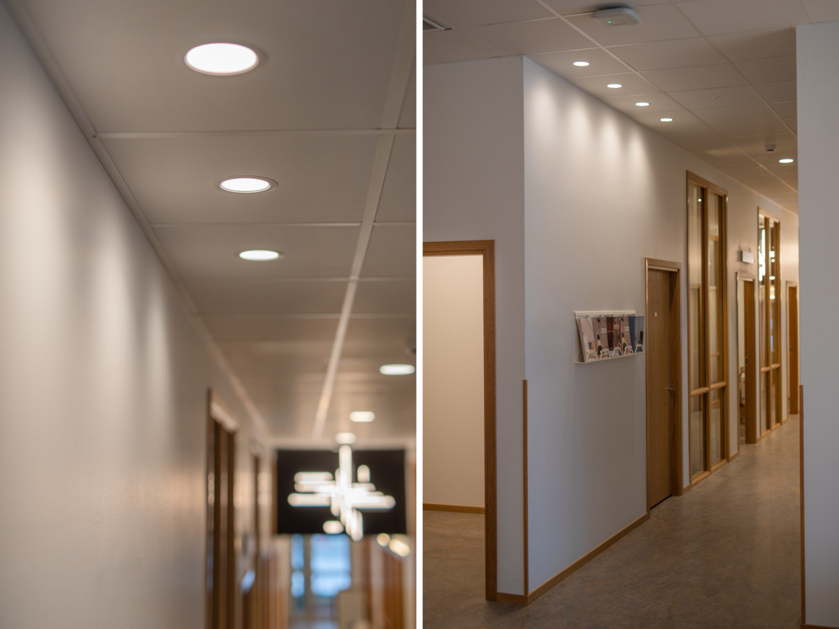 Instead of replacing with cover rings, choose a complete luminaire in the size you need. Echo is a large product family for holes from 103-300mm. Dimmable all-round luminaire for public environments.that need a lot of light, such as in rooms with high ceilings, corridors or shops. Perfect for new installations and to replace compact fluorescent tube luminaires. Selectable colour temperature via DIP switch. Echo M and Echo L have adjustable lumen output via DIP-switch. Comes complete with driver for phase dimming or DALI-2. DALI-2 comes with Q-box Micro, push-in terminals and screwless strain relief. Dimmable with most common dimmers on the market.