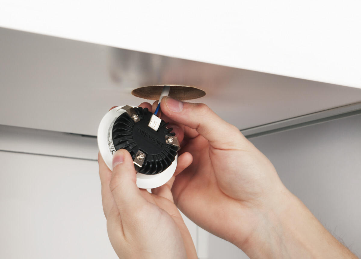 Low-build tiltable downlight, made for installation in 28mm secondary spaced boarding and approved for installation directly against insulation. Cut-out between 55-63mm – perfect replacement for old halogen fittings in renovation and maintenance work. Reflector technology, highly glare-free light distribution and extremely good colour rendering, Ra>95. IP44 rated for installation indoors or outdoors. Complete with phase dimmable driver, 3-pole push-in terminal for through wiring and screwless strain relief for cable or flex hose 230V. Dimmable with most common dimmers on the market.