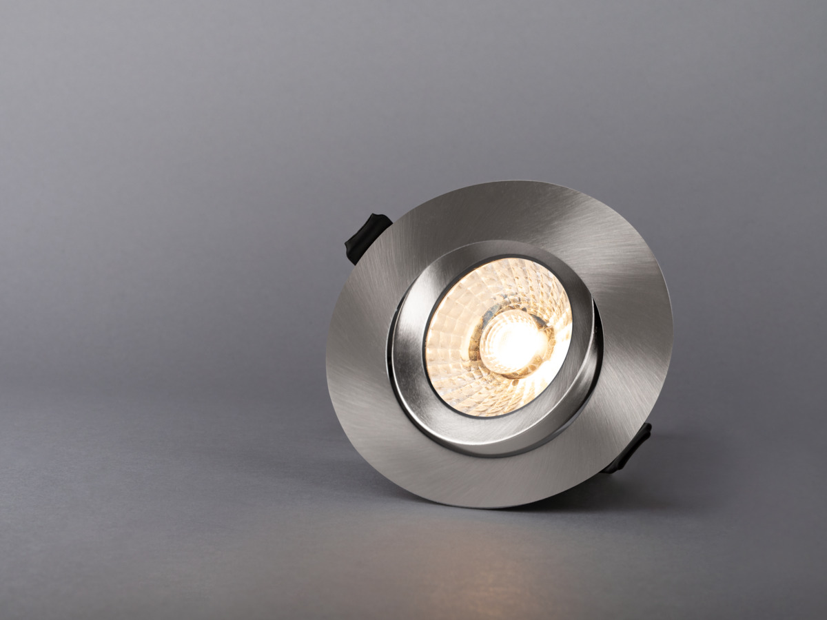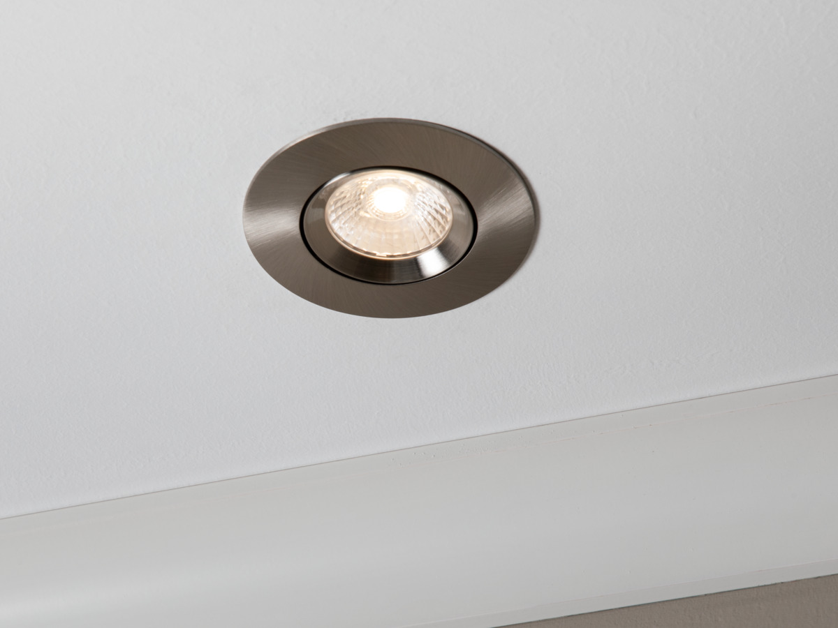 Low-build, effective and tiltable downlight, made for installation in 28mm secondary spaced boarding and approved for installation directly against insulation. Modern LED and reflector technology for a high luminous efficacy with distinct and glare-free light distribution with very good colour rendering, Ra>95. An easily installed IP44 luminaire, complete with a phase dimmable driver, 3-pole push-in terminal for through wiring and strain relief for cable or flex hose 16 mm. Dimmable with most common dimmers on the market.
