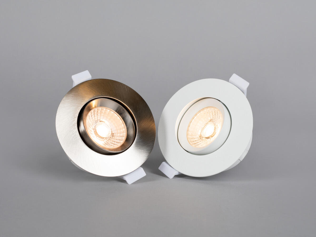 Dimmable multifunctional all-round downlight for 230V with Comfort Lens. Twist function makes it possible to twist the luminaire 2x150° and tilt 30°– perfect if you want to direct the light or fit in a sloping ceiling for example. Selectable colour temperature via DIP-Switch ColourTemp directly in the luminaire. IP44 luminaire for use indoors and outdoors. Can be installed directly against insulation in 28mm secondary spaced boarding with 13mm plaster. Complete with dimmable driver, 3-pole push-in terminal for through wiring and strain relief for cable or flex hose 16 mm. Dimmable with most common dimmers on the market.