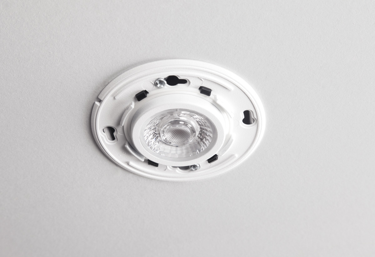Smart, easily installed downlight for 230V with Comfort Lens. Mains dimmable driver and push-in, loop-in, loop-out terminal block integrated into the housing. Adapted for ceiling and junction boxes with keyhole mounting or directly against insulation together with the ISO cover included. Minimum box depth 30mm. Complete, energy-efficient fixture that requires very little space, also suitable for embedment with box in concrete ceiling. Useable in all rooms thanks to its IP44 rating.