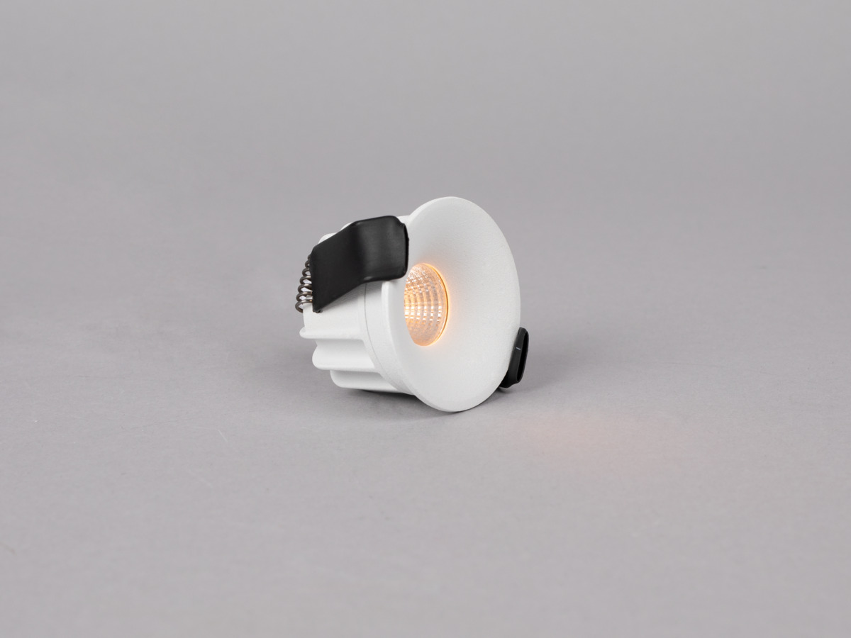 Exclusive small tiltable accent luminaire with well-developed reflector technology. Gives a discrete and glare free light with very good colour rendering, Ra>95. Small and low-build – perfect for secondary spaced boarding 28mm with 13mm gypsum. Beautiful as accent lighting solo or in group when directed lighting is desired. Complete with small mains dimmable driver, push-in, loop-in, loop-out terminals and screwless strain relief for easy installation. Dimmable with the most commonly available dimmers on the market.