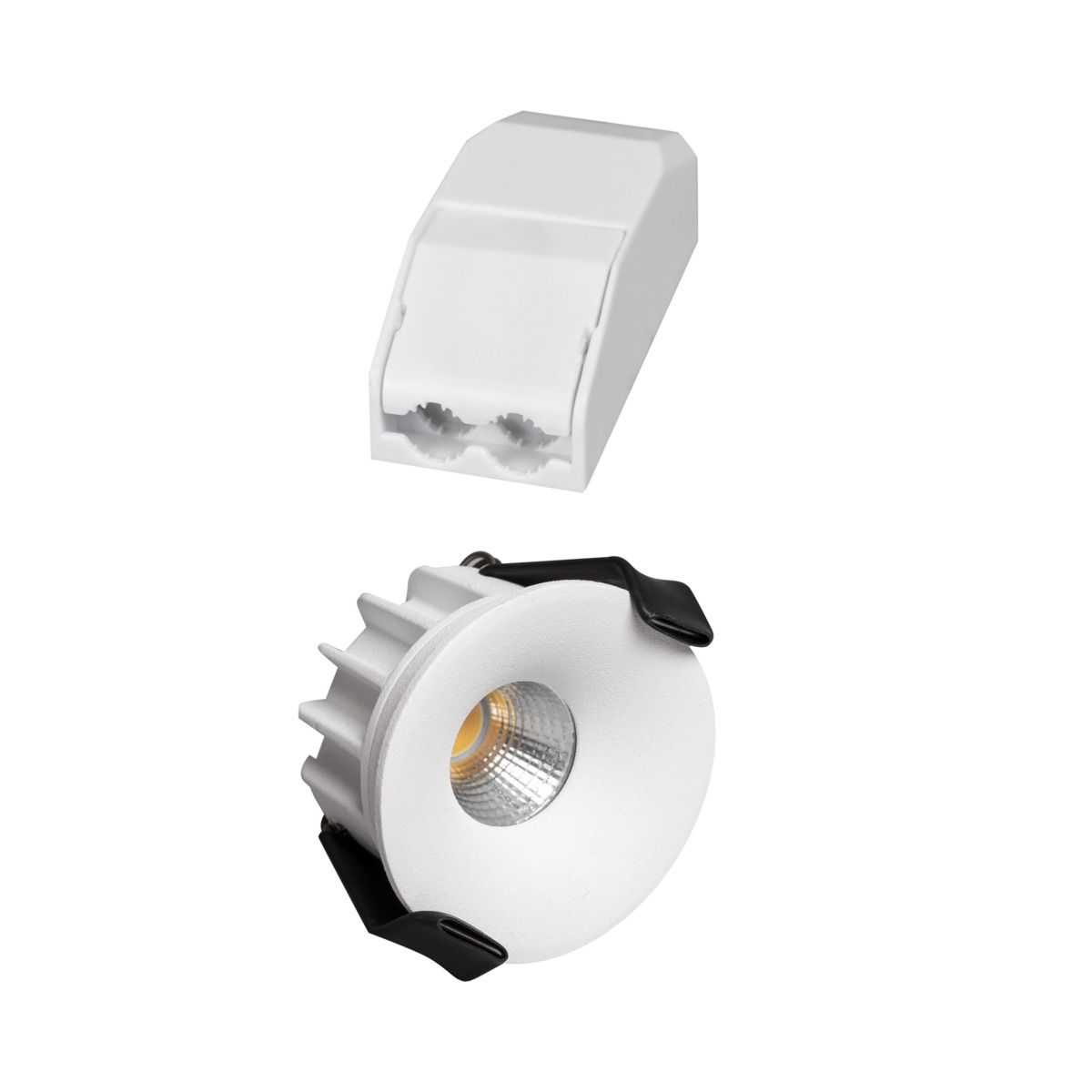 Exclusive small-format accent luminaire with well-developed reflector technology. Recessed light source giving a discrete and glare free light with very good colour rendering, Ra>95. Small and low-build – perfect for secondary spaced boarding 28mm with 13mm gypsum. Beautiful as accent lighting solo or in a group. Black front ring available as an accessory. Complete with small mains dimmable driver, push-in, loop-in, loop-out terminals and screwless strain relief for easy installation. Dimmable with the most commonly available dimmers on the market.