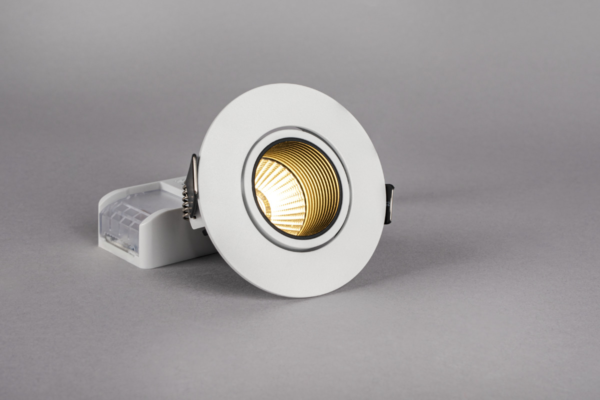 Exclusive small tiltable accent luminaire with well-developed reflector technology. Gives a discrete and glare free light with very good colour rendering, Ra>95. Small and low-build – perfect for secondary spaced boarding 28mm with 13mm gypsum. Beautiful as accent lighting solo or in group when directed lighting is desired. Complete with small mains dimmable driver, push-in, loop-in, loop-out terminals and screwless strain relief for easy installation. Dimmable with the most commonly available dimmers on the market.