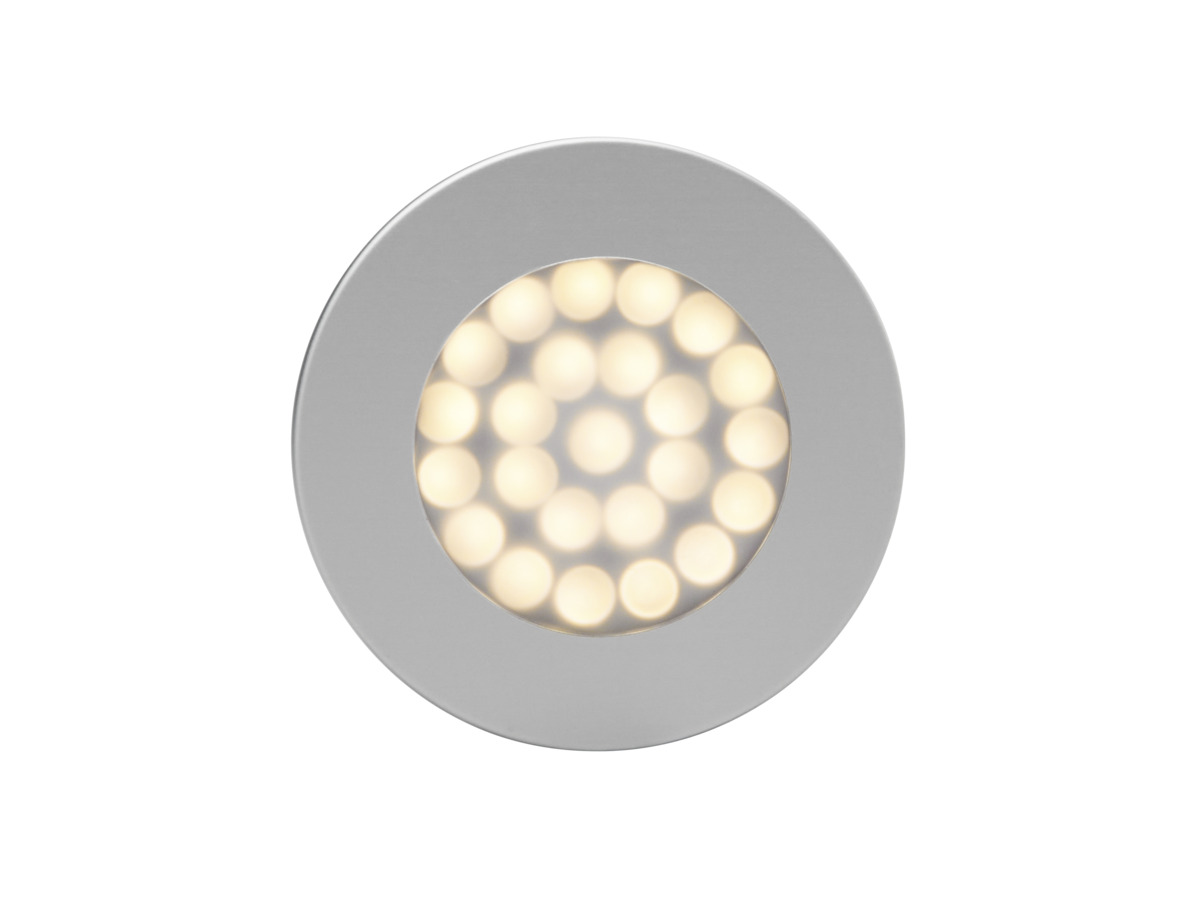 LED luminaire with installation depth of only 9 mm, perfect as illumination in cabinets and under shelves in kitchens and bathrooms. Energy-efficient LED light source of 2W with 55° light distribution. Replaces a corresponding 10W halogen spot with an energy saving of 80%. Housing of tough aluminium. Comes with 2 m cable with quick contact, connects to LED trafo 12V DC via parallel coupling, can be regulated with LED dimmer. Spacer ring for surface mounting available as an accessory.
