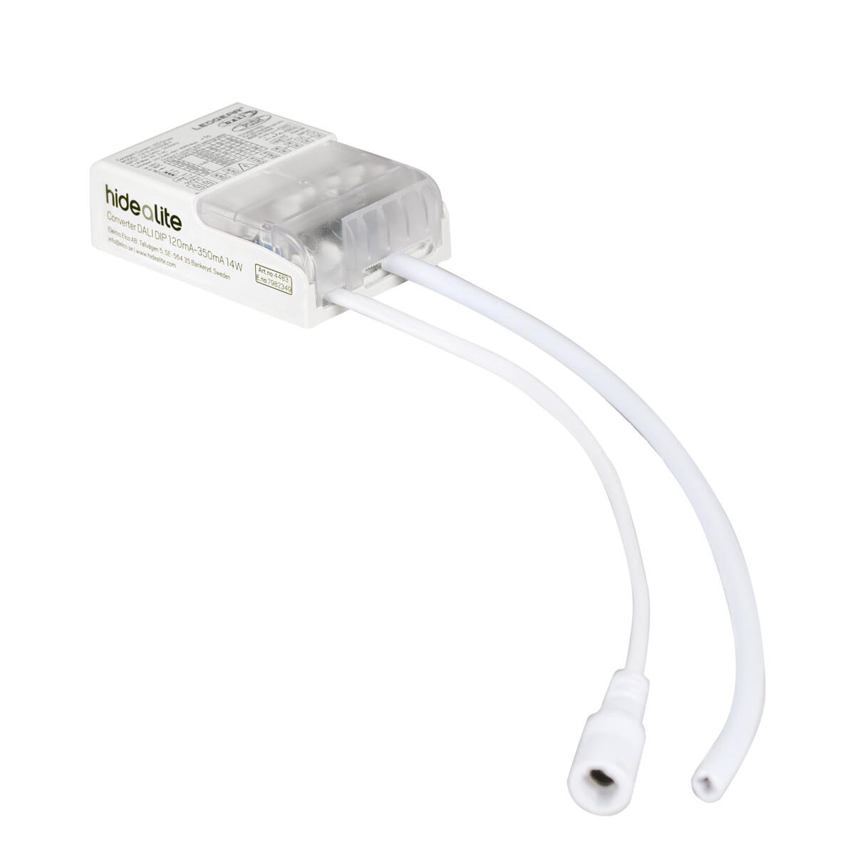 DALI converter for constant current luminaires. The primary side has push-in, loop-in, loop-out terminals and screwless strain relief for cables. Secondary side has prepared wires with phono connectors.