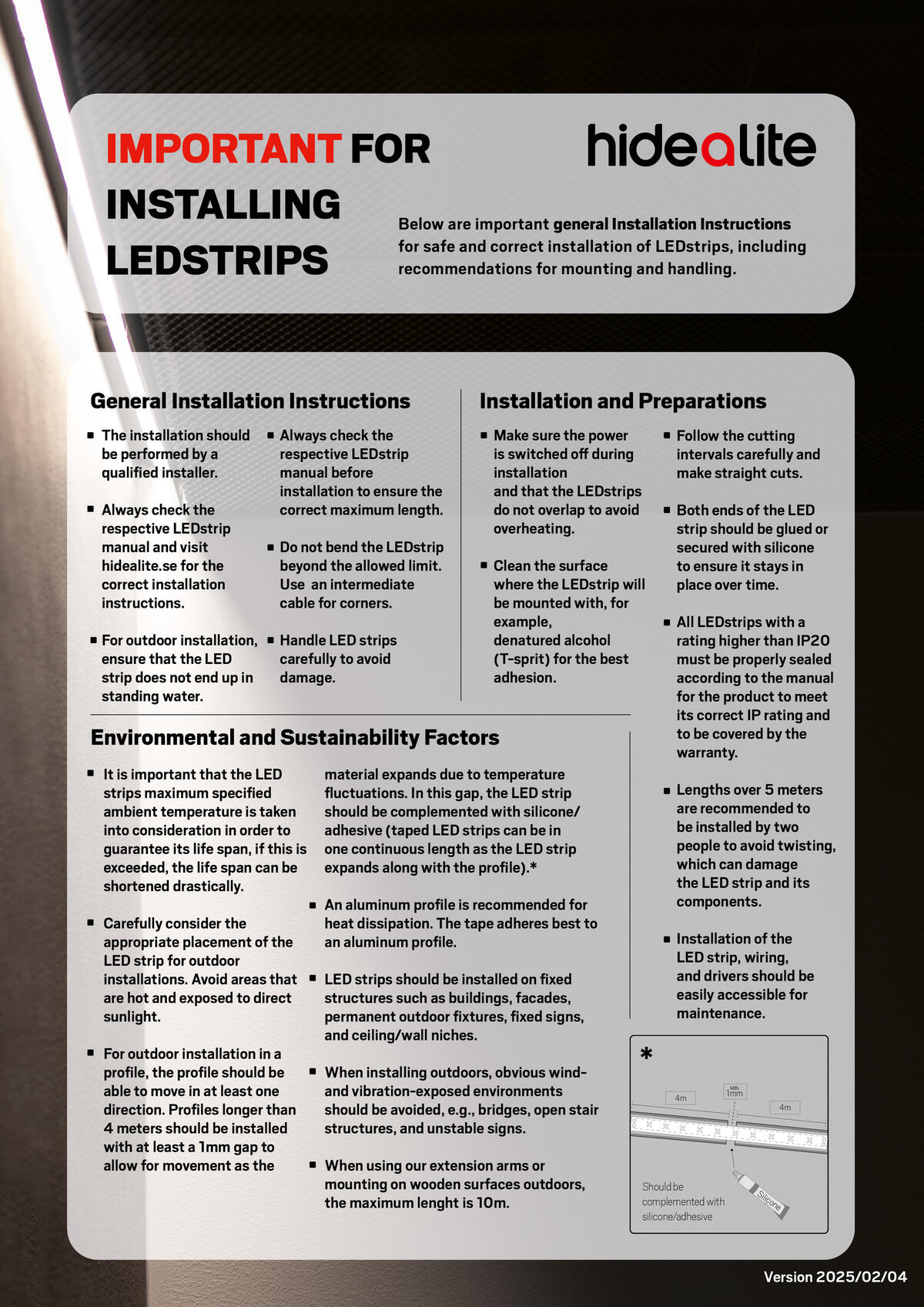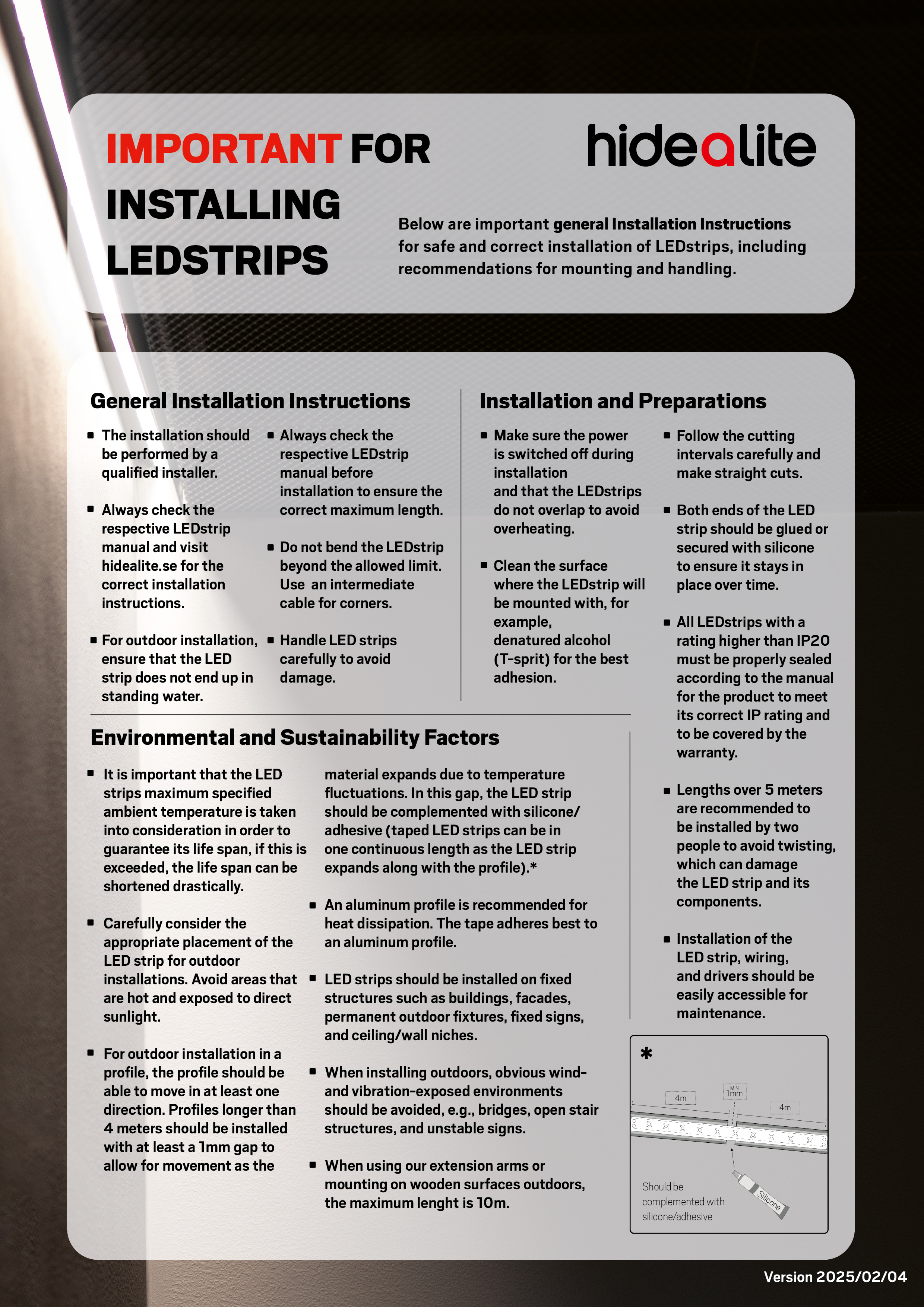 • Max length: 30m. Note, 10 meters for installation on e.g. decks/wooden structures. LED strips should be installed on fixed struc- tures such as buildings, facades, permanent outdoor fixtures, fixed signs, and ceiling/wall niches.