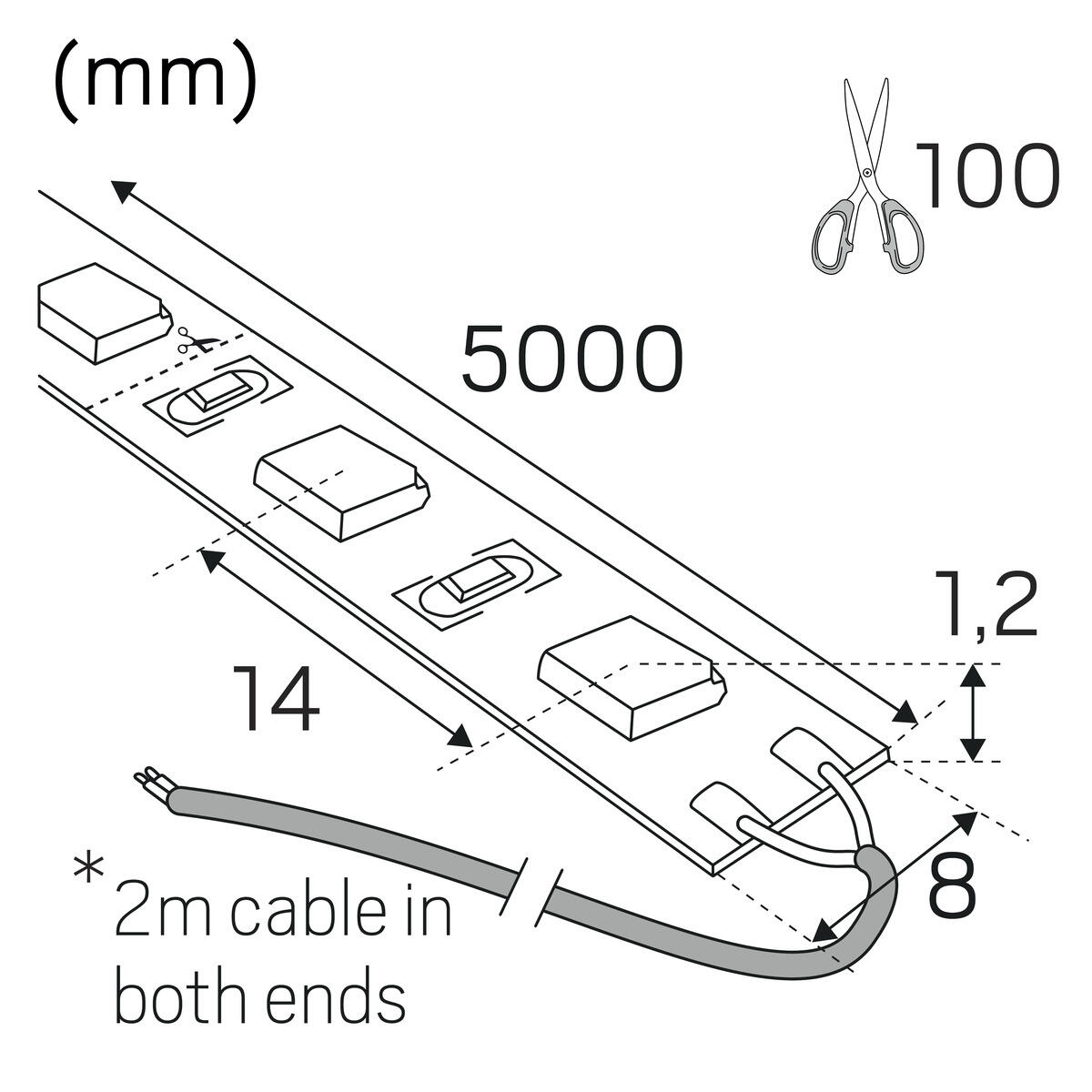 LEDstrip with short spacing between LEDs giving high lumen output with very good light quality and colour rendering, Ra>90. Perfect for a homogenous light with opal cover- also with lower profiles. Comes as standard in rolls of five metres with 2 m connecting cable at each end, 1pc quick connection and self-adhesive tape for easy installation. Also available made to measure in optional lengths with 5cm cut-off intervals. Upon request, running meters with connection cables are delivered according to your specifications; running meters are delivered as standard without connection cables. Drivers are ordered separately according to required dimmer technology and placing.