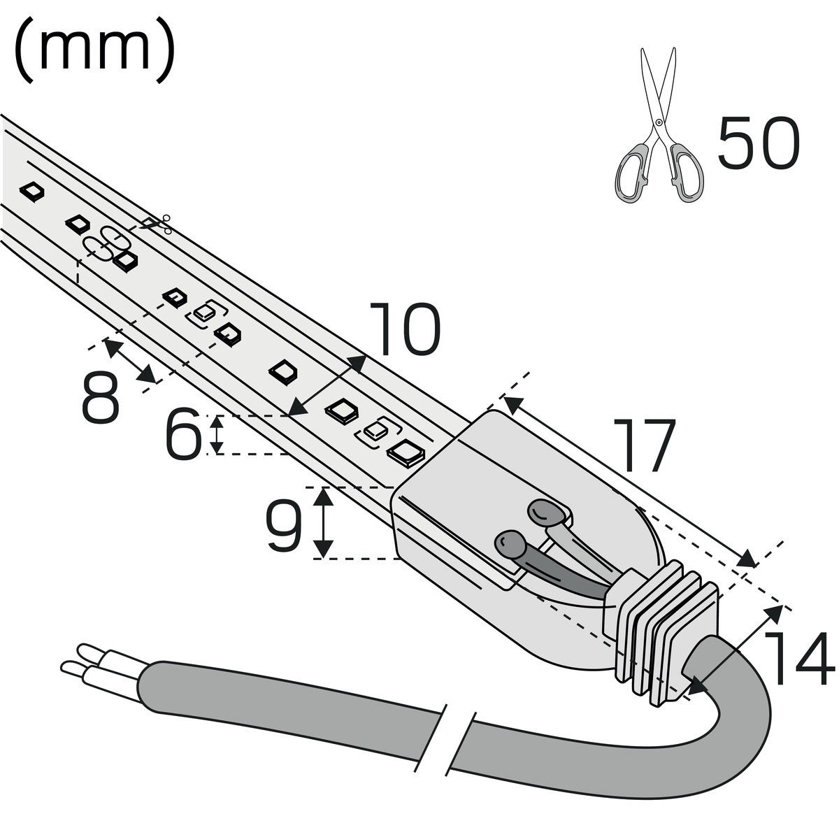 LEDstrip with encapsulated opal coloured casing in silicone, which creates an evenly lit line with noout profile or cover. COB technology with small gaps between diodes for very good efficiency. Short cutting increments of 30mm and seamless joints make it simple to create custom lengths. Comes as standard in rolls of five metres with 2 m connecting cable at each end, 2pcs end connections, self-adhesive tape for easy installation. Upon request, running meters with connection cables are delivered according to your specifications; running meters are delivered as standard without connection cables. Drivers are ordered separately according to desired dimmer technology and placing. Maximum length 5m.