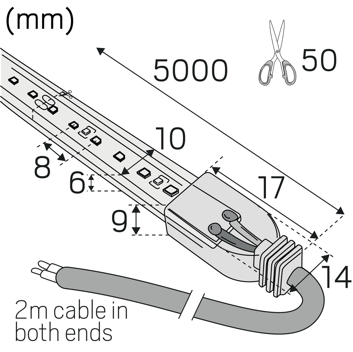 LEDstrip with encapsulated opal coloured casing in silicone, which creates an evenly lit line with noout profile or cover. COB technology with small gaps between diodes for very good efficiency. Short cutting increments of 30mm and seamless joints make it simple to create custom lengths. Comes as standard in rolls of five metres with 2 m connecting cable at each end, 2pcs end connections, self-adhesive tape for easy installation. Upon request, running meters with connection cables are delivered according to your specifications; running meters are delivered as standard without connection cables. Drivers are ordered separately according to desired dimmer technology and placing. Maximum length 5m.