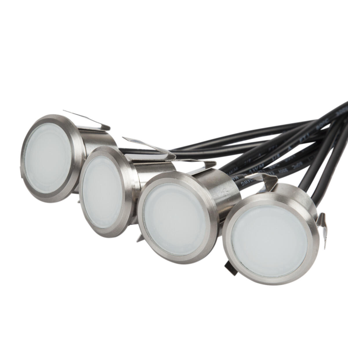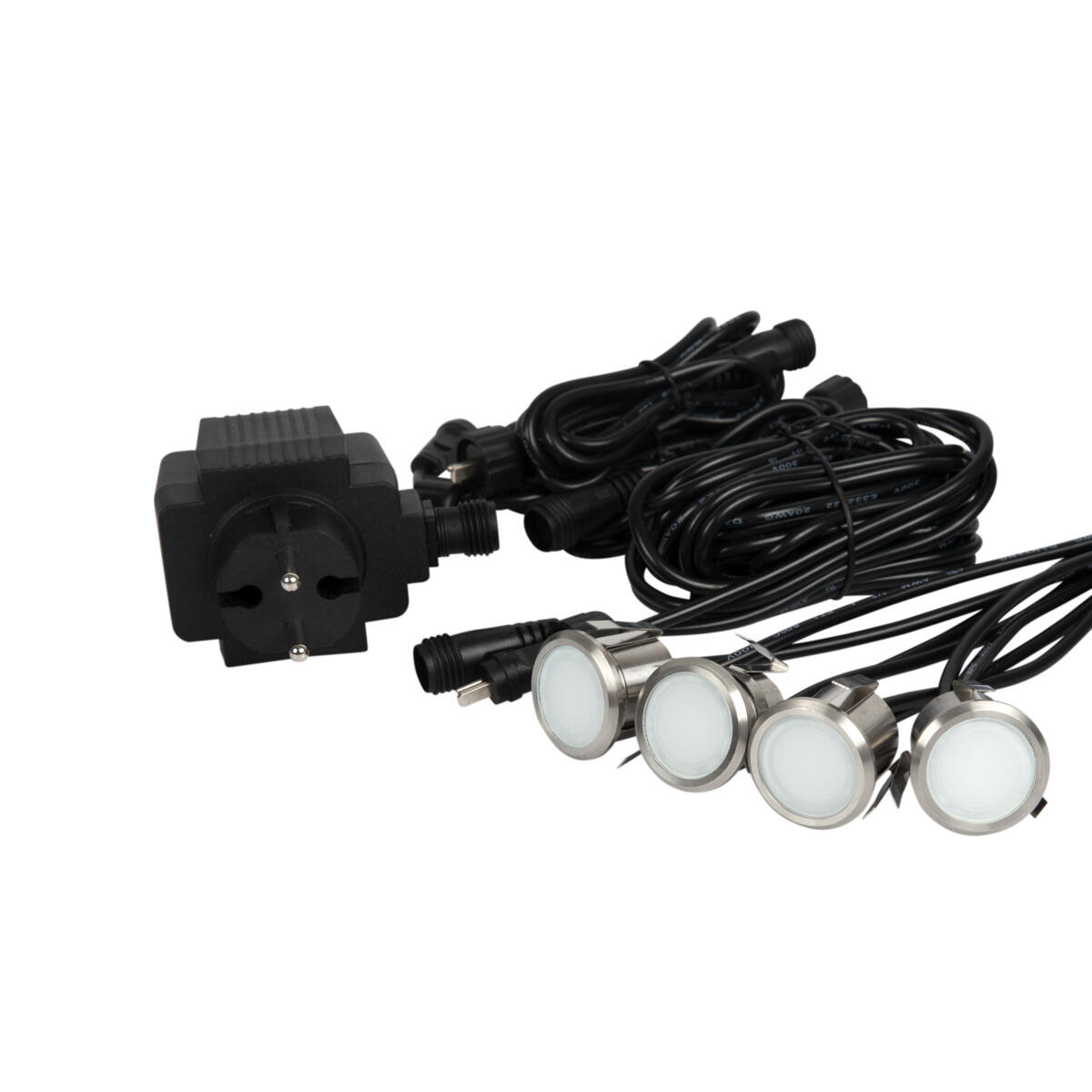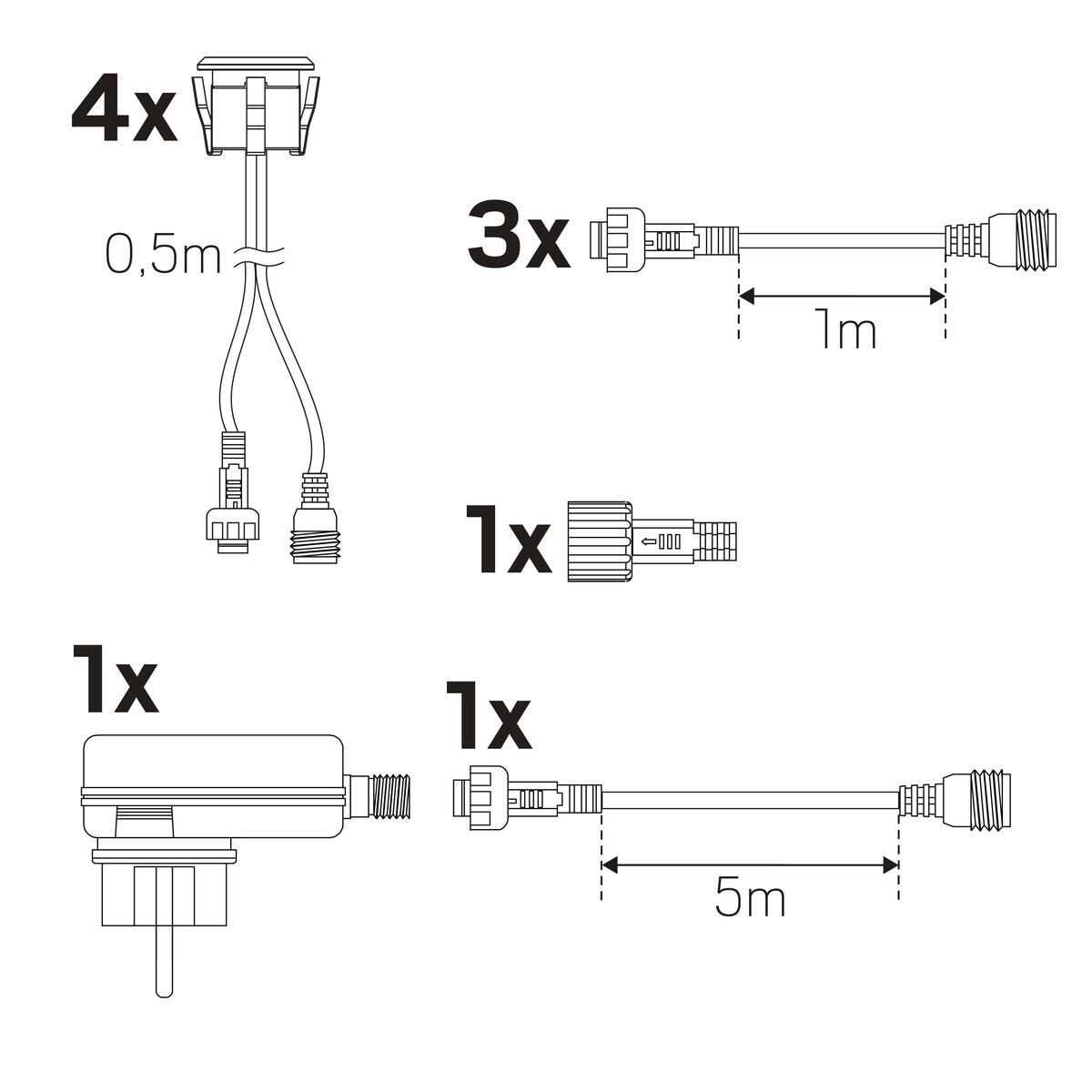 Kit for decorative step lighting with low energy consumption. Create striking staircase lighting, for example on patios and decks. The kit includes 4x IP67 luminaires, 3x 1m extension cables with quick connectors and 1x IP44 plug-in transformer with 5m cable. Can be combined with Spotlight Garden and Decklight Garden thanks to the common coupling system. Up to 12 luminaires can be connected to a single transformer.