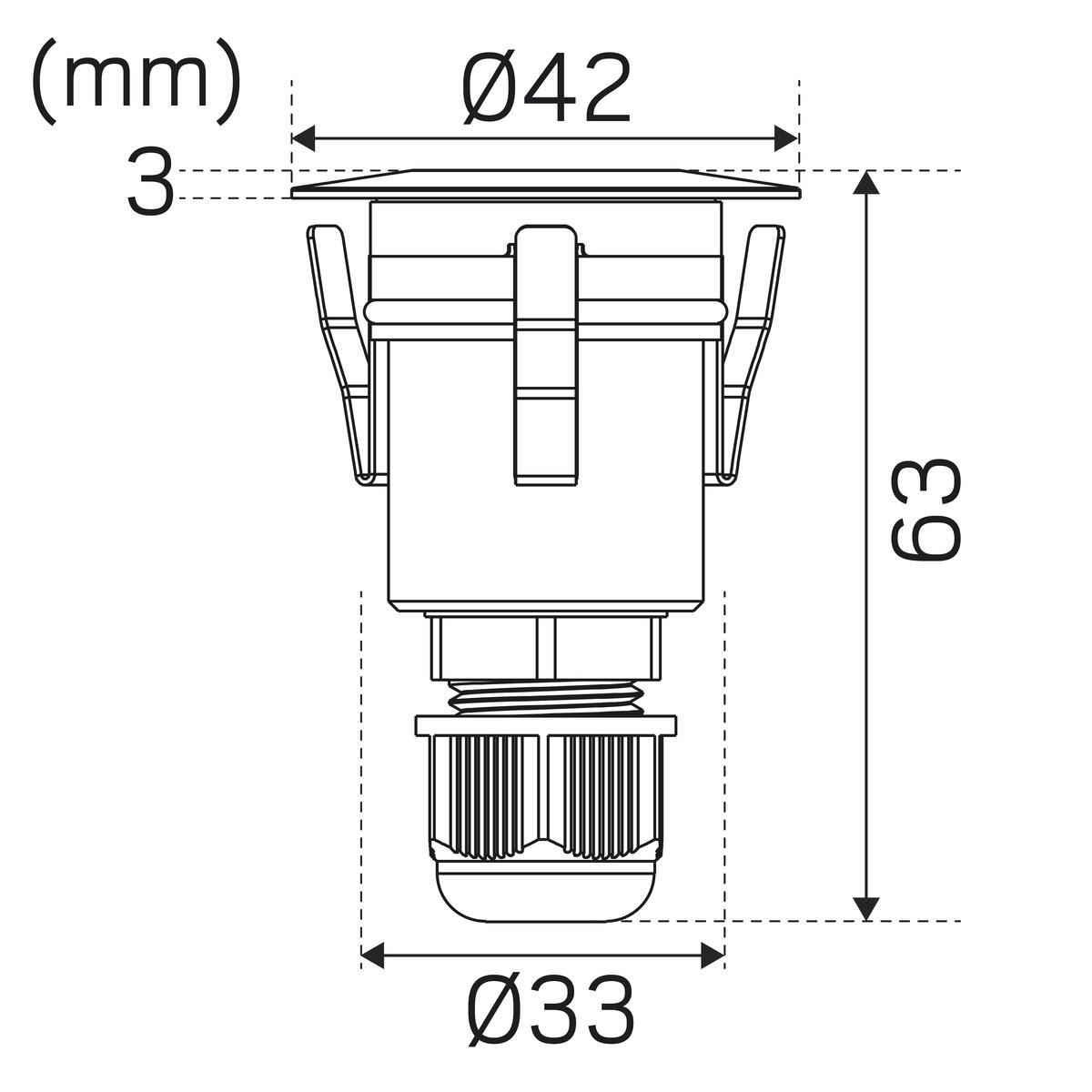 Dimmable 230V-luminaire in IP67 model for wooden deck and ground. Illuminate and highlight walls, pathways, and stairs, mainly outdoors. Housing and front ring in aluminium, with clips for optimal connection also in living materials, such as wood. Integrated mains dimmable driver delivered with 2m pre-mounted rubber cable. Sleeve for embedment available as accessory. Dimmable with the most commonly available dimmers on the market. Combine with the accessory Ground Connector 4-way IP68 for an easy installation.