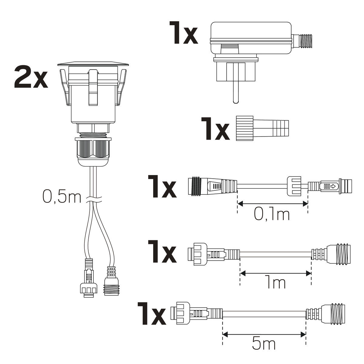 Decorative step lighting with low energy consumption. Create striking staircase lighting, for example on patios and decks. Comes with 2×0.5 m rubber cables with screw connections. As an accessory there is also a transformer and 1 or 5 meter extension cables. Can be combined with Spotlight Garden and Decklight Garden thanks to the common coupling system.