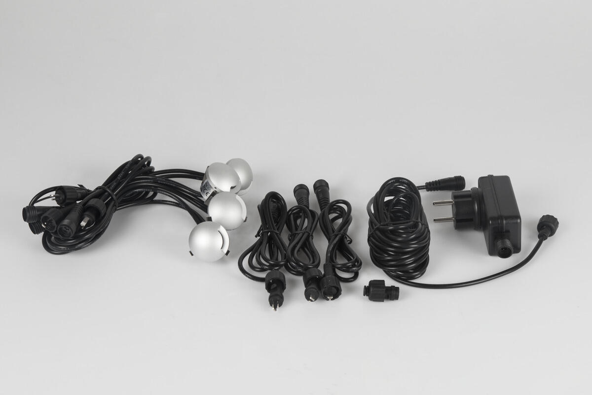 Kit with decorative luminaire with low energy consumption for striking lighting on a wooden deck. You can also increase security around your home by creating pleasant effects with outdoor lighting. Comes with 2x 0.5 m rubber cables with screw connections. The kit comprises 4x IP67 luminaires, 3x 1 m extension cables with quick connectors and 1x IP44 plug-in transformer with 5 m cable. Can be combined with Spotlight Garden thanks to the common coupling system.