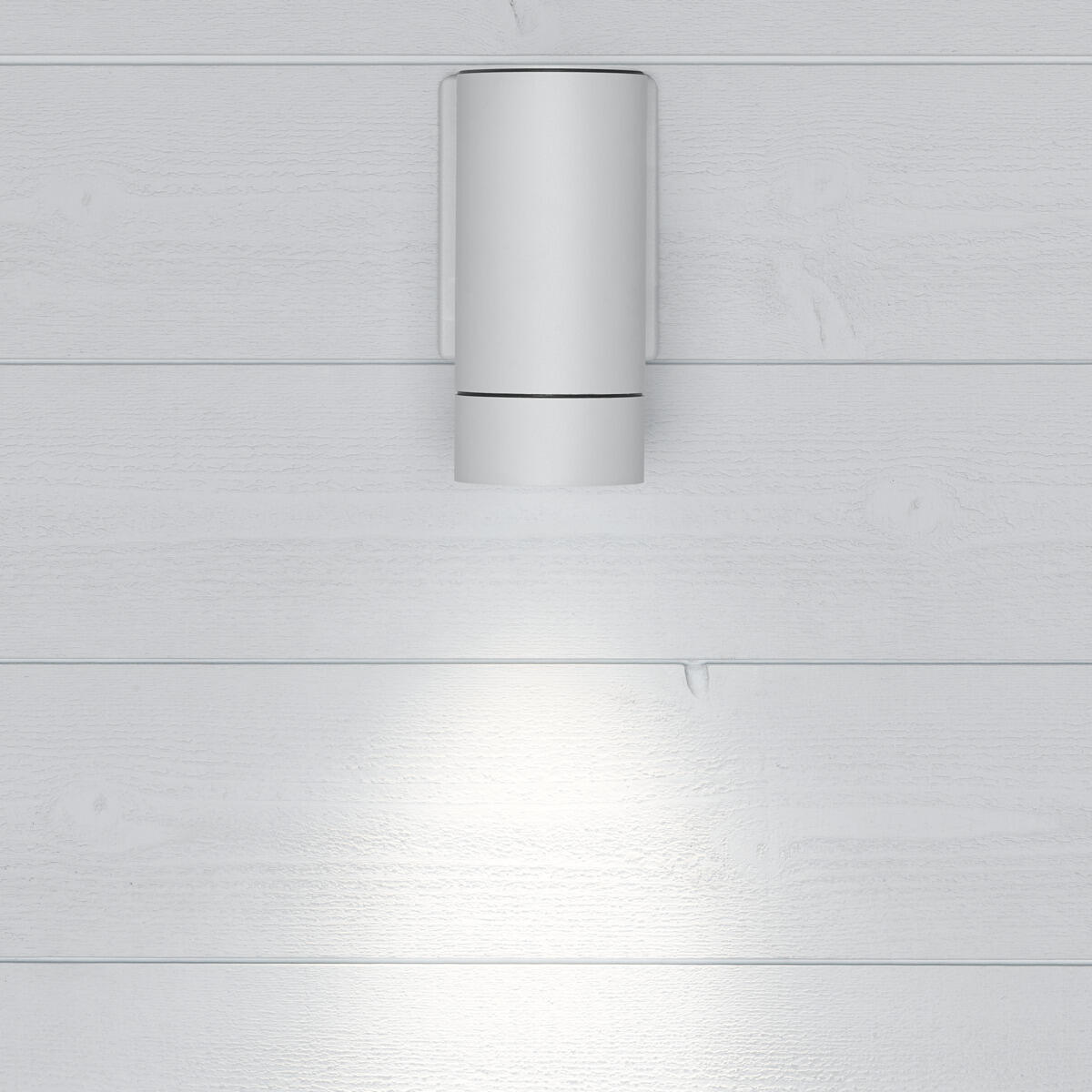 A neat wall fitting with GU10 socket with a clean conical design providing an asymmetrical light spread that lights up the wall and the ground below. Simple installation thanks to separate rear element with dual cable bushings and push-in terminal block for through wiring. Spacers for surface-mounted cable routing included. IP54 rated with durable powder coating for tough environments in white, grey or anthracite. The light source can be selected for customised color temperature and luminous intensity.