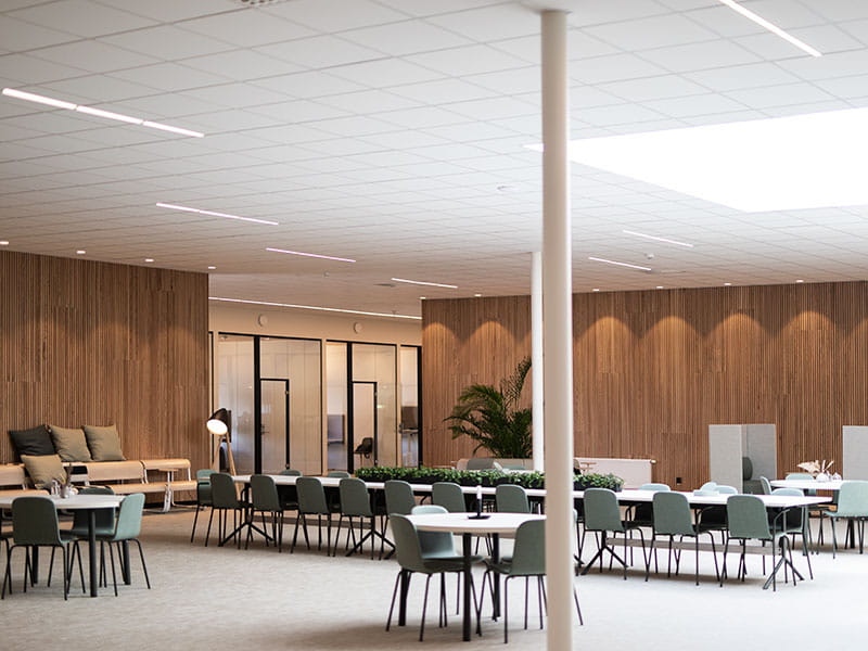 Rakennuksen suurin tila on ruokailutila, jossa on avoin ja viihtyisä ilmapiiri. Rimaseinän edessä on sohvia ja muita istuintiloja niille, jotka haluavat viettää aikaa yhdessä tai eristäytyä ja keskustella ykistyisemmin.Tässä tilassa Solo Mini valaisee puupaneelin, joka yksi rakennuksen näyttävimmistä pinnoista, ja luoden selkeitä valokuvioita ja tunteen, että tilassa tapahtuu jotain kun päivänvalo keskellä päivää suodattuu suuresta kattoikkunasta sisään.