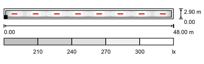 Varastokäytävällä on nyt 16 kpl 2x49 W IP23 loisteputki-valaisinta 6 m korkeudella. Valaistusvoimakkuus varastokäytävällä on noin 250 lux. Nyt valaisimet vaihdetaan LED-valaisimiin.