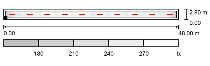 Vaihtoehto 2 kuvaa varastokäytävää, jossa on 10 kpl Indline IP23 XL Medium 840 (4240458) -valaisimia rajoitettuna 400 mA virtaan.