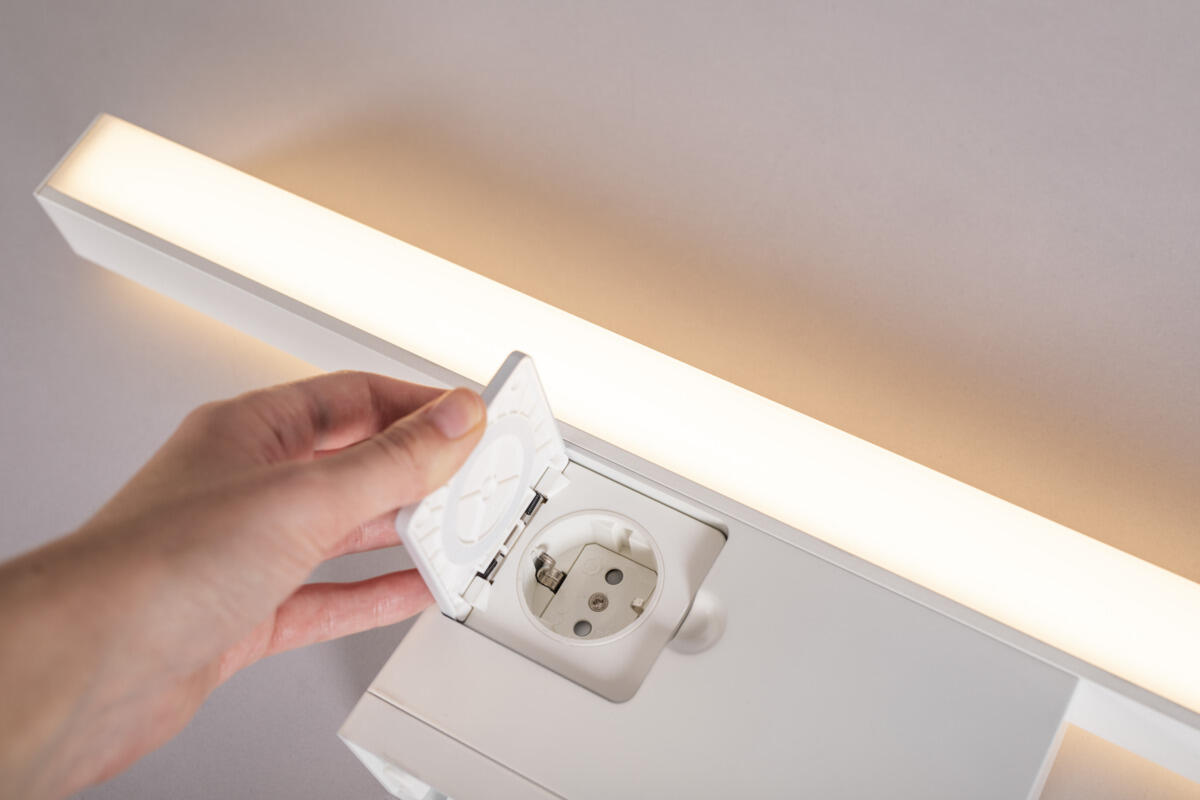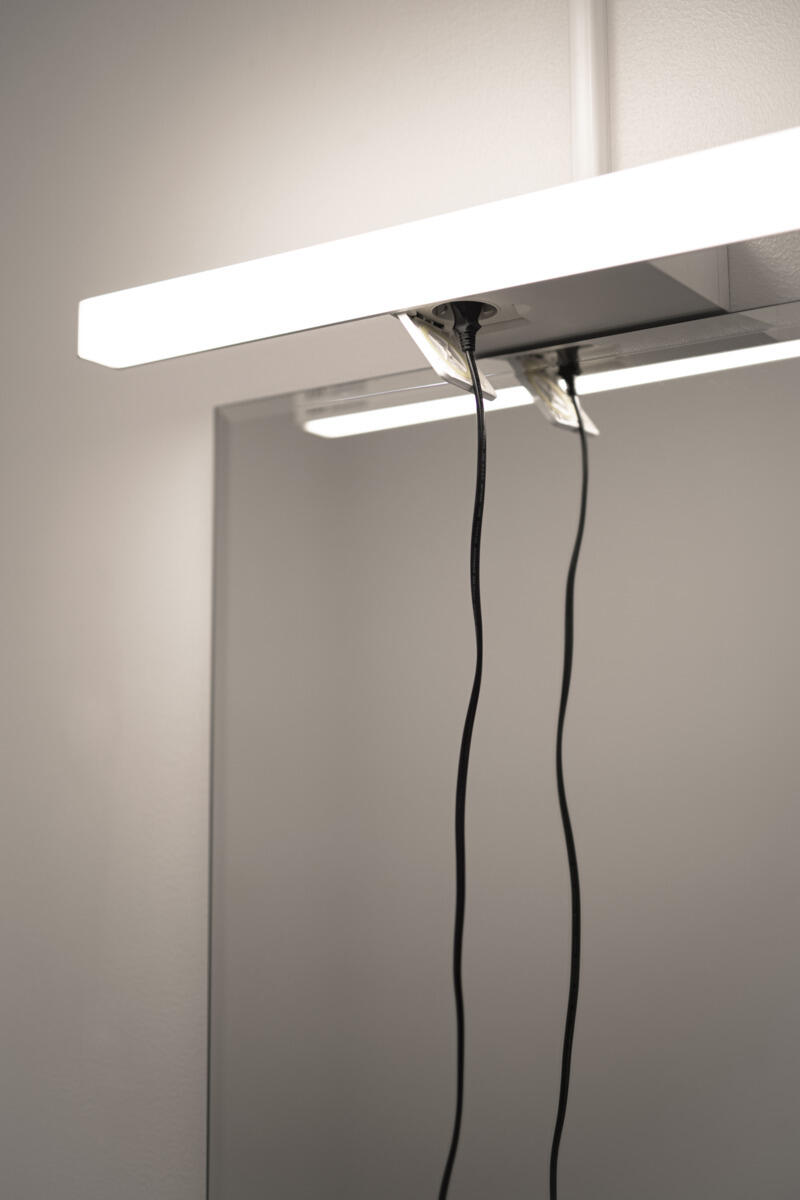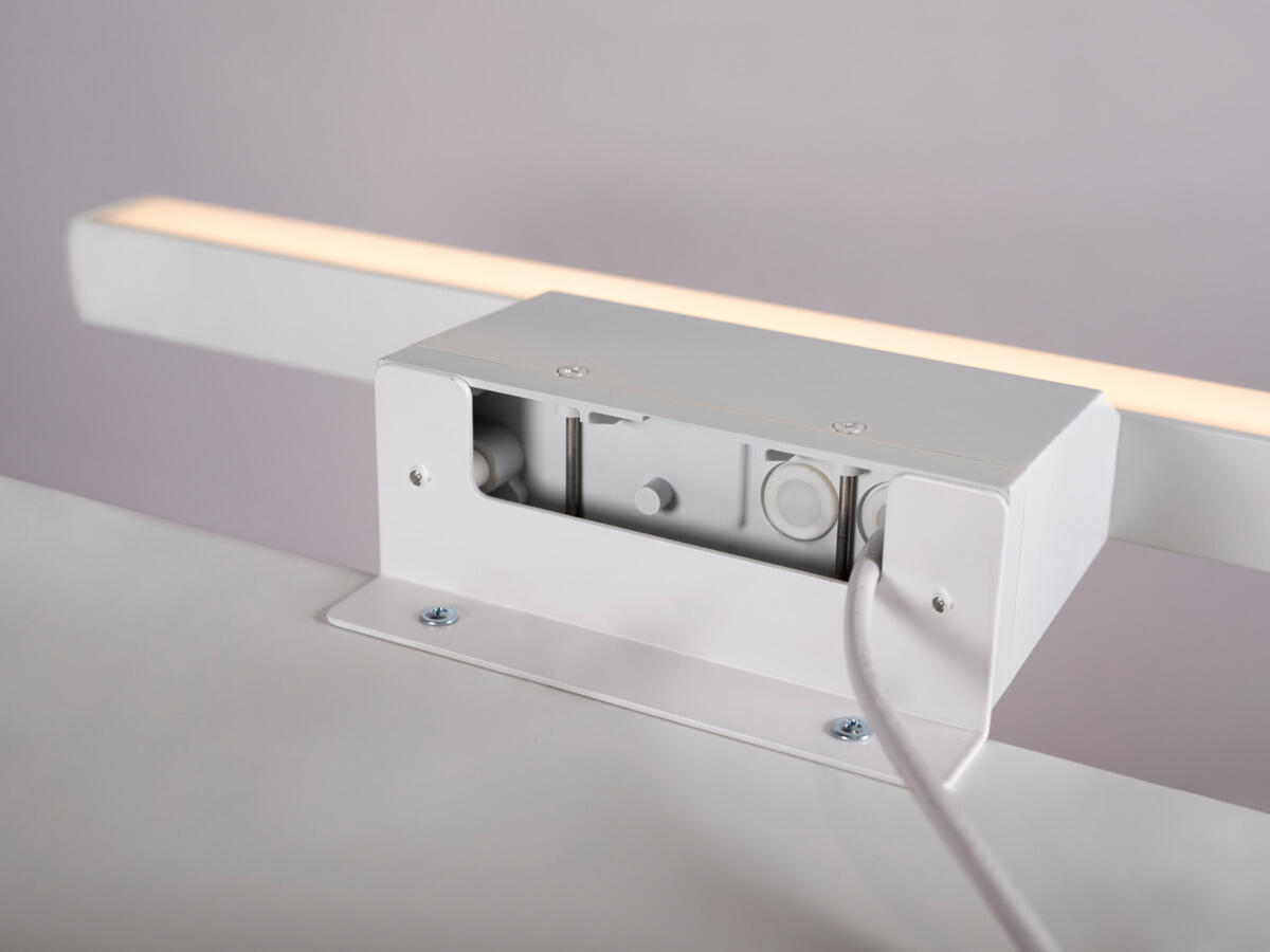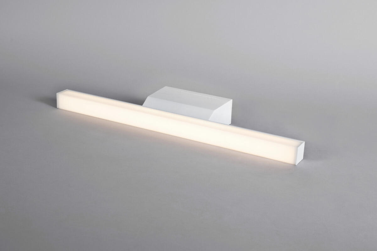 Ajattomasti muotoiltu peilivalaisin, valkoiseksi maalattua alumiinia (RAL 9016) huurretulla kuvulla. Antaa tasaisen valokuvion. Erittäin hyvä värintoisto, RA>90 IP44-luokitus ja täyttää pienten kylpyhuoneiden vaatimukset julkisissa ja yksityisissä tiloissa. Voidaan asentaa seinää vasten ja kylpyhuoneen kaapin päälle mukana tulevalla kiinnikkeellä, mukana myös koroke johtojen pinta-asennusta varten. Vaihehimmennettävä liitäntälaite integroitu valaisimeen suoraa 230V kytkentää varten. Kaksoisläpiviennit, joista toinen keskitetty, sekä pikaliitin ketjutusta varten.